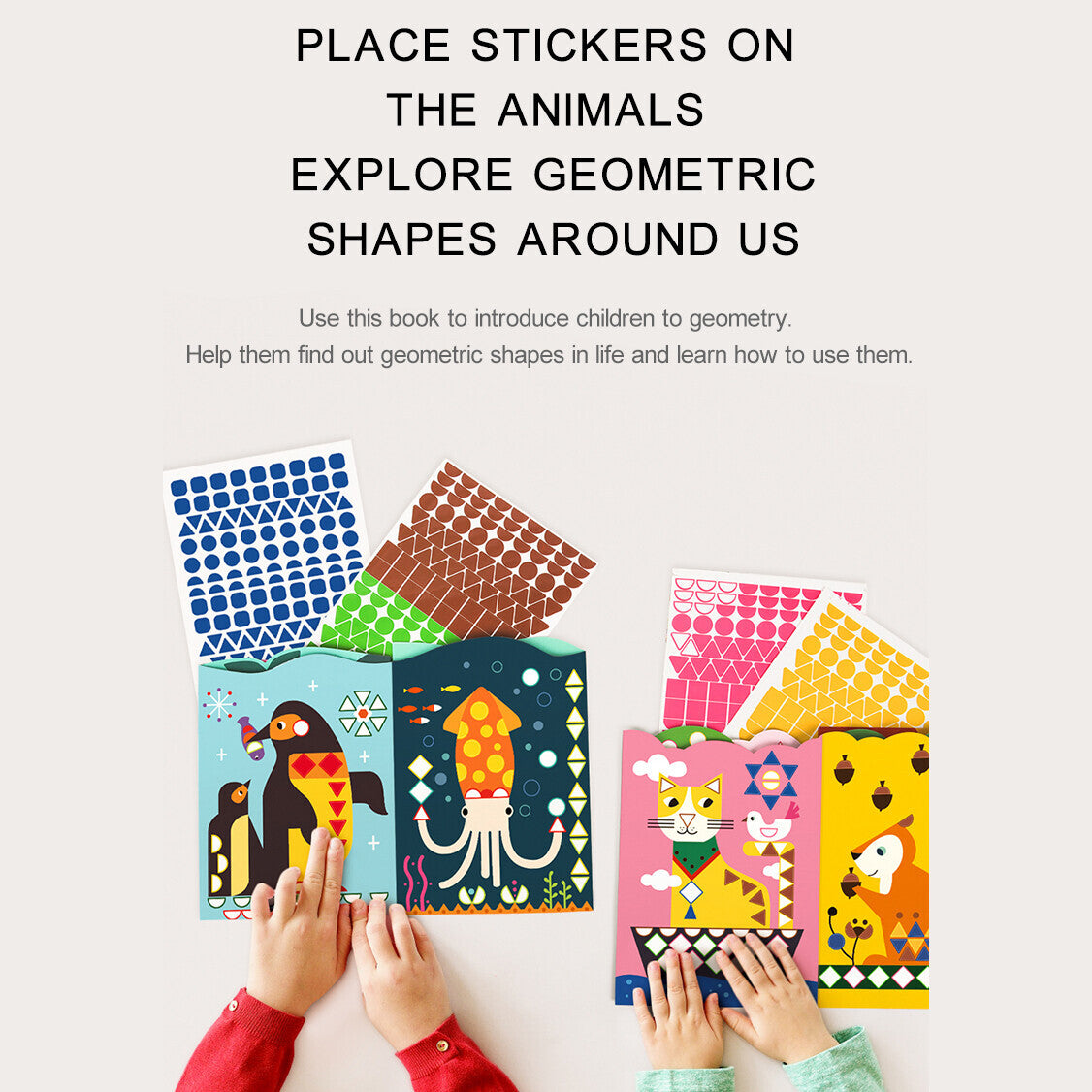 Geometric stickers in a small fold-out book, all about animals! Fold out the included booklet to reveal 12 panels (front & back) with unique animal designs. Place the correct colour and shape on the booklet to complete the picture. This Mideer Sticker Set encourages children to learn shapes and colours while practicing fine motor skills and sequencing.