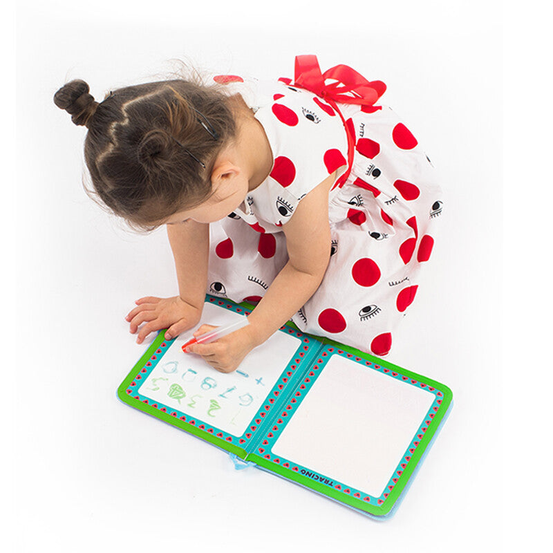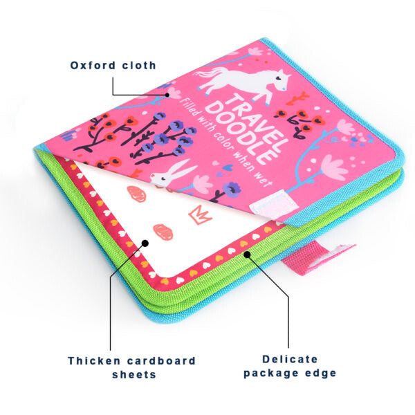 This book comes with 6 reusable coloring pages and 1 water pen. Just fill water into the water pen and start to draw, the colors change when in contact with water. Once it dries, the color fades up so the book can be reused multiple times.