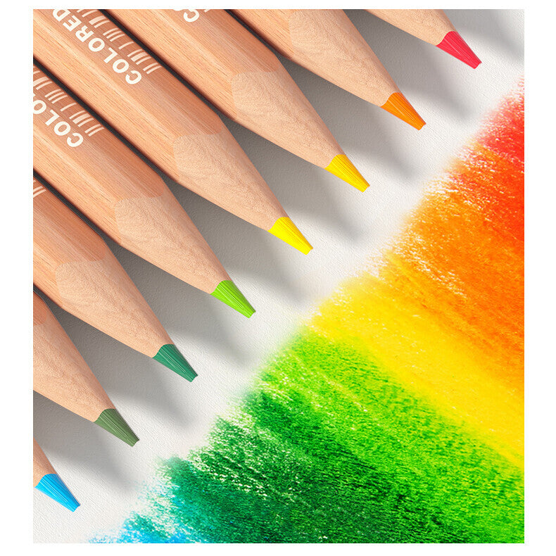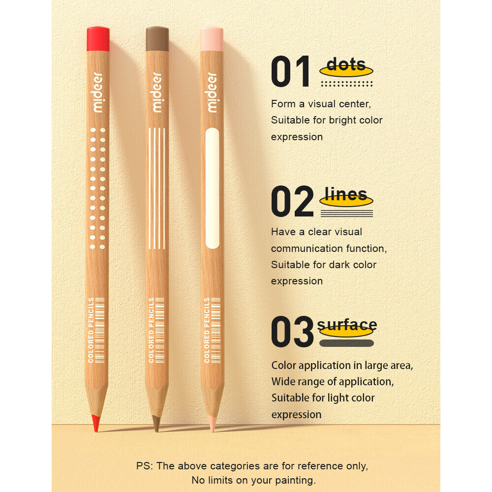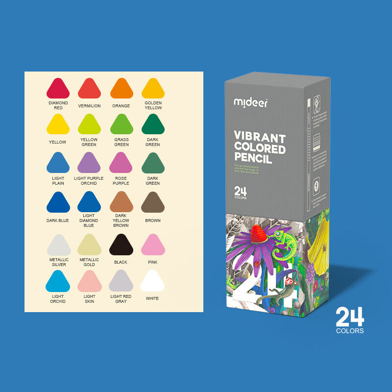 Mideer Vibrant Coloring pencils are a great addition to any artist's collection. Mideer pencils offer an extensive color palette with high quality and vibrant colors to produce the finest drawings. The 4mm thick core provides strong resistance against cracking and chipping. The pencils are coded to make choosing colors easier for different applications such as shading, outlining, etc. The triangular body provides a comfortable, ergonomic grip so you can continue for hours without tiring. The box allows for easy access when in use and secure storage when not in use.