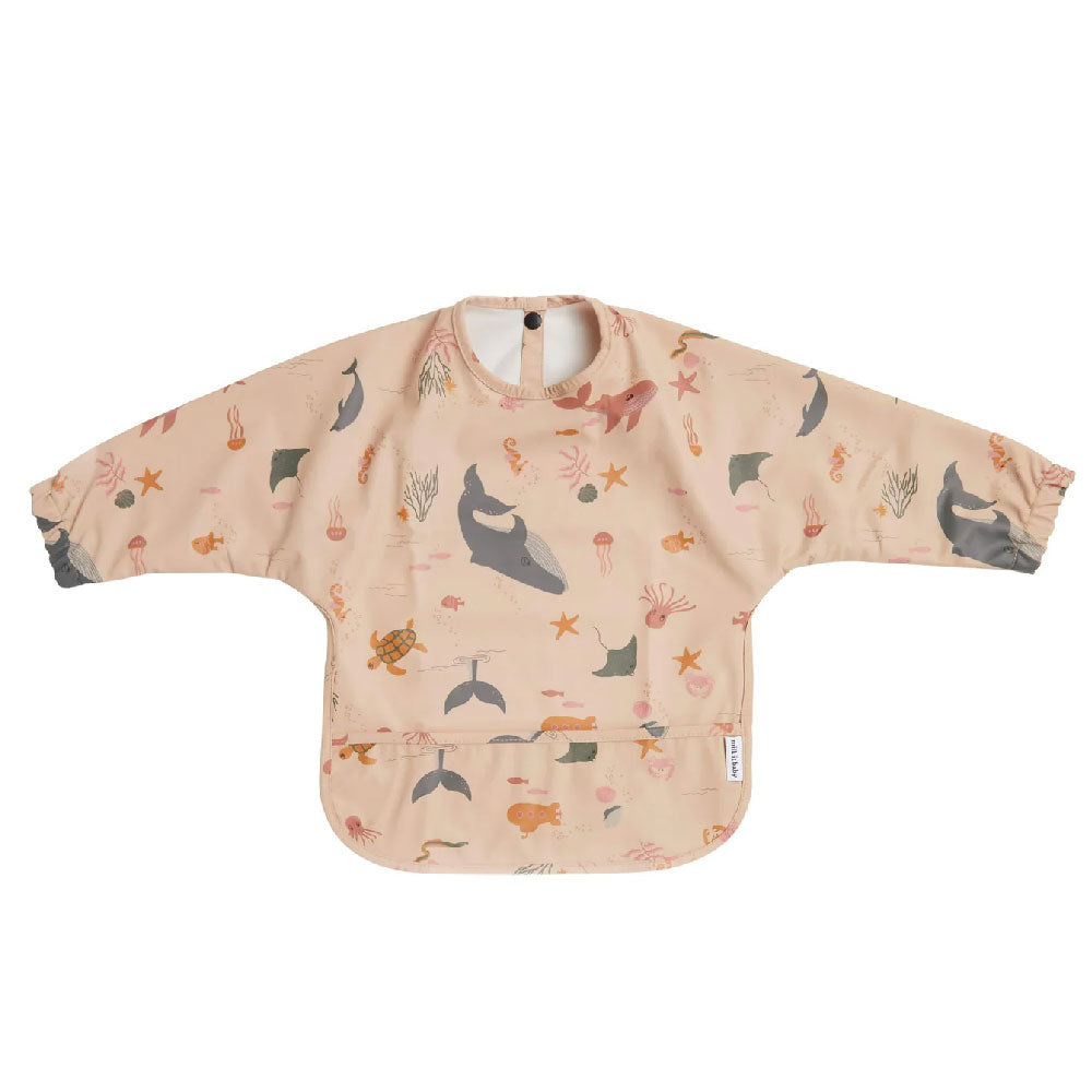 Our Ocean Friends Printed Bib Sleeve has a very misty style, great for babies who appreciate their marine friends. It's designed to have a tamed look with aqua animals swimming around- quite a wardrobe staple if we dare say! Psst did you hear about what whales like to eat? Fish and ships, and the food off of your child's bibs.