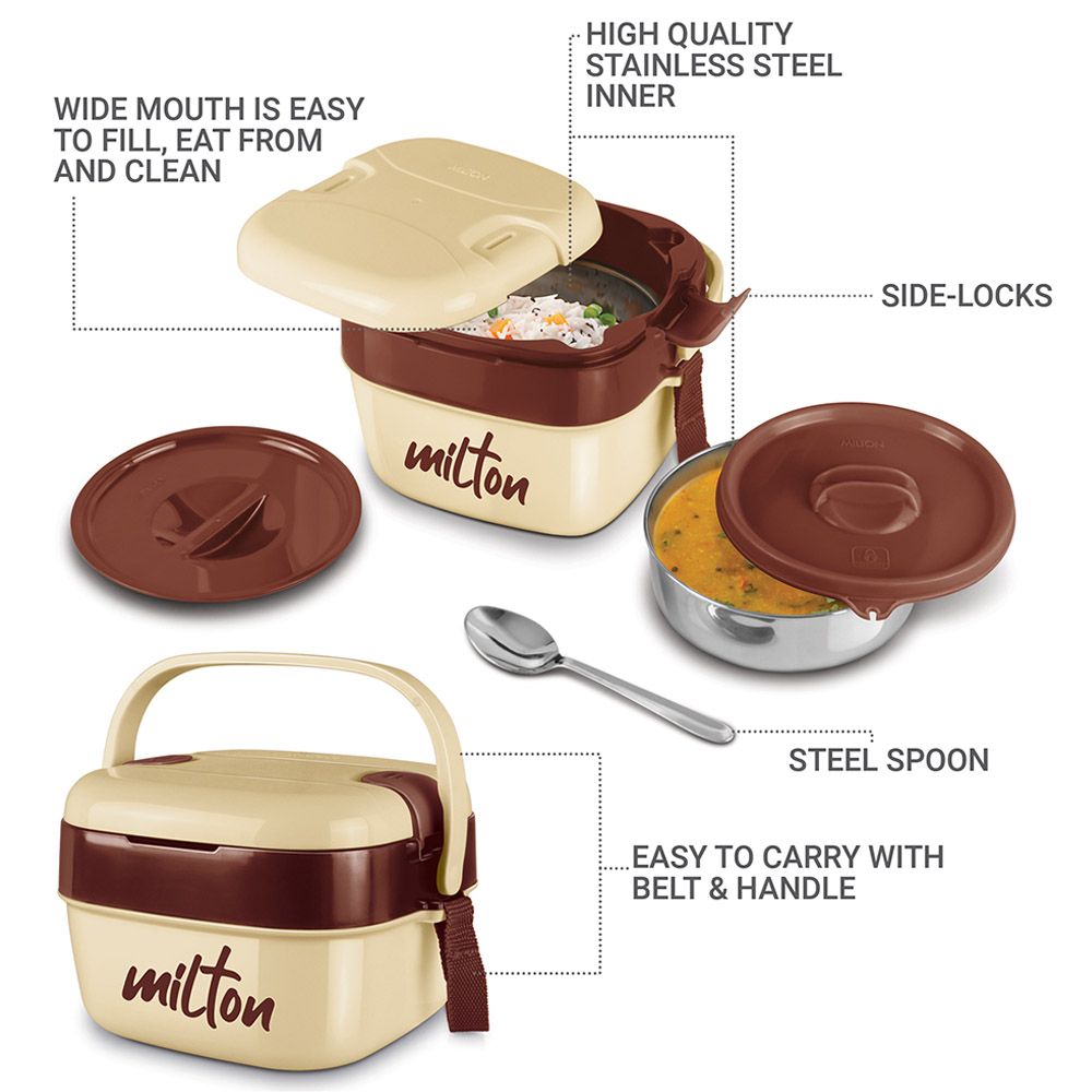 Milton Cubic Insulated Lunch Box has Inner Stainless Steel Which Keeps Food Warm and Fresh for Hours. The Tiffin Is Made Of Food Grade Material And Stainless Steel Inner. A Separate Small Stainless Steel Leak Proof Container for Dry & Wet Food along with Steel Spoon. Ideal Lunch Carrying Solution for Everyday Use. Carrying your own home-cooked food to office is both a delicious way of consuming your daily meals. The Milton tiffin box is a great solution for carrying these meals in a stylish package. This set helps keep your meals warm when you are on the go. Create fun filled Nutritious Lunches for your kids during this Back to School Season or office going people.