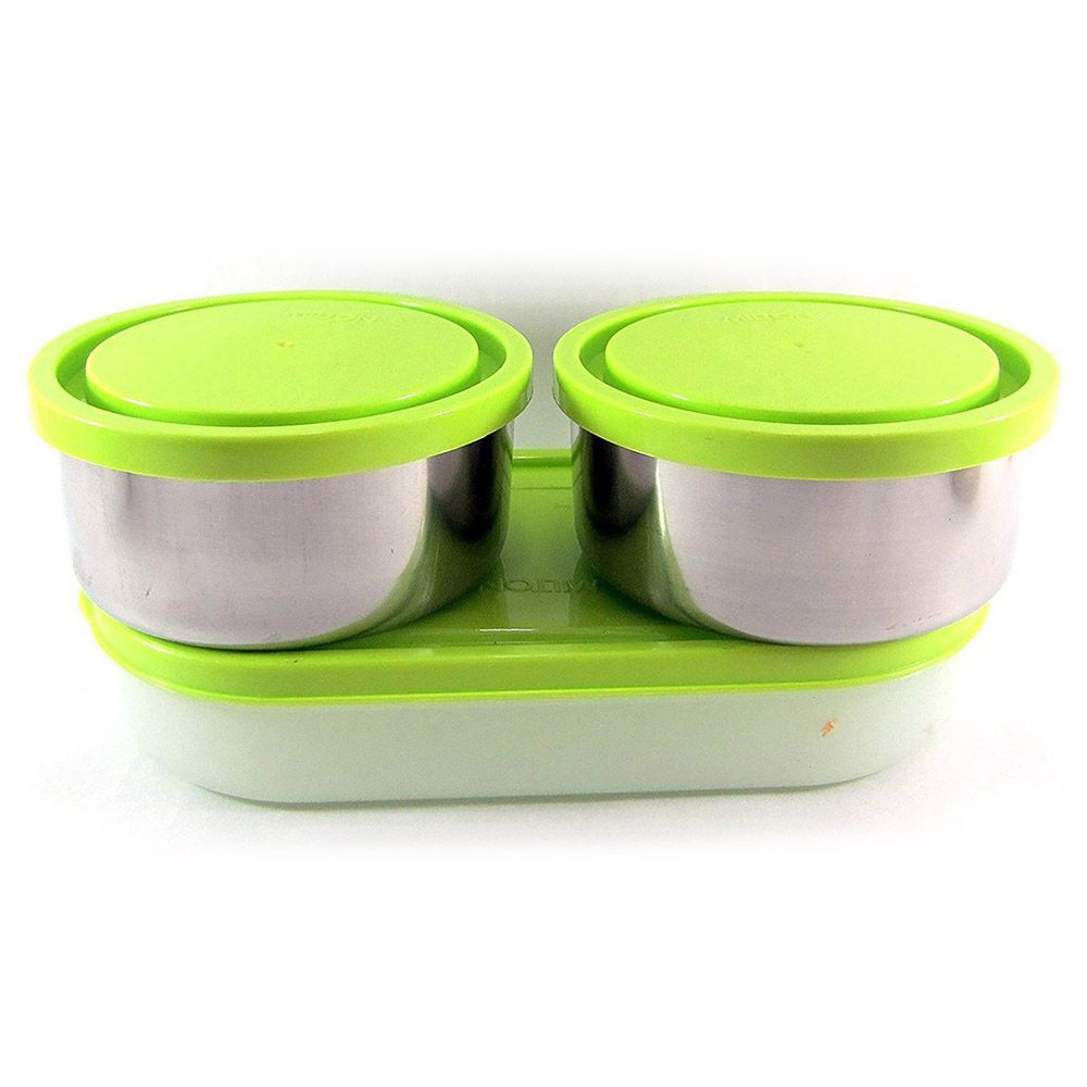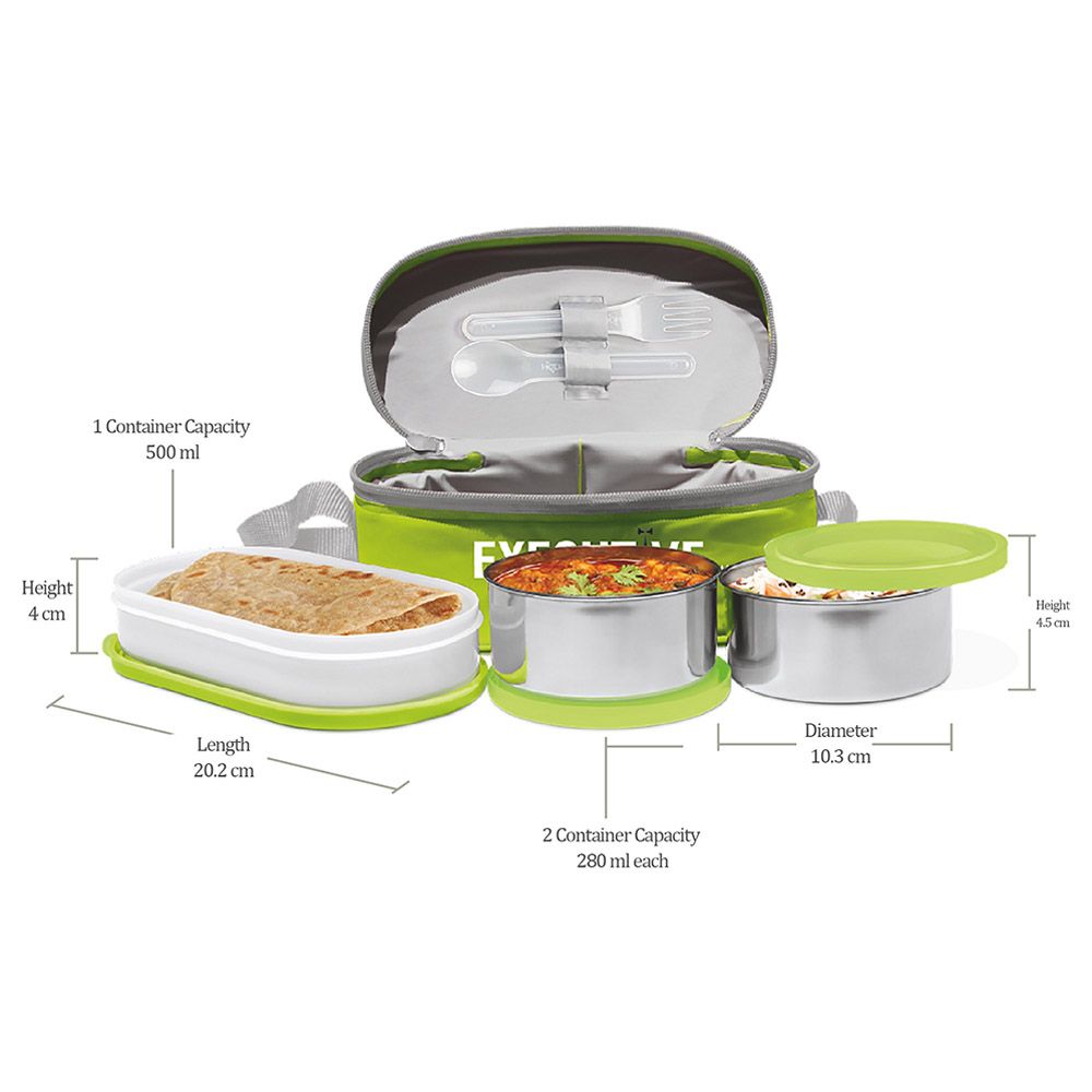 - Material: Stainless Steel and Plastic. Package Content: 1 - Piece Executive lunch Box (2 Round container, 280 ml Each and 1 Oval container,450 ml)