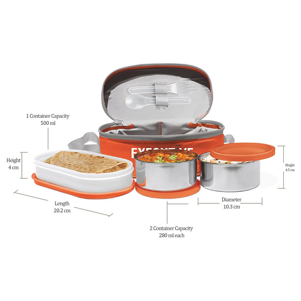 - Material: Stainless Steel and Plastic. Package Content: 1 - Piece Executive lunch Box (2 Round container, 280 ml Each and 1 Oval container,450 ml)