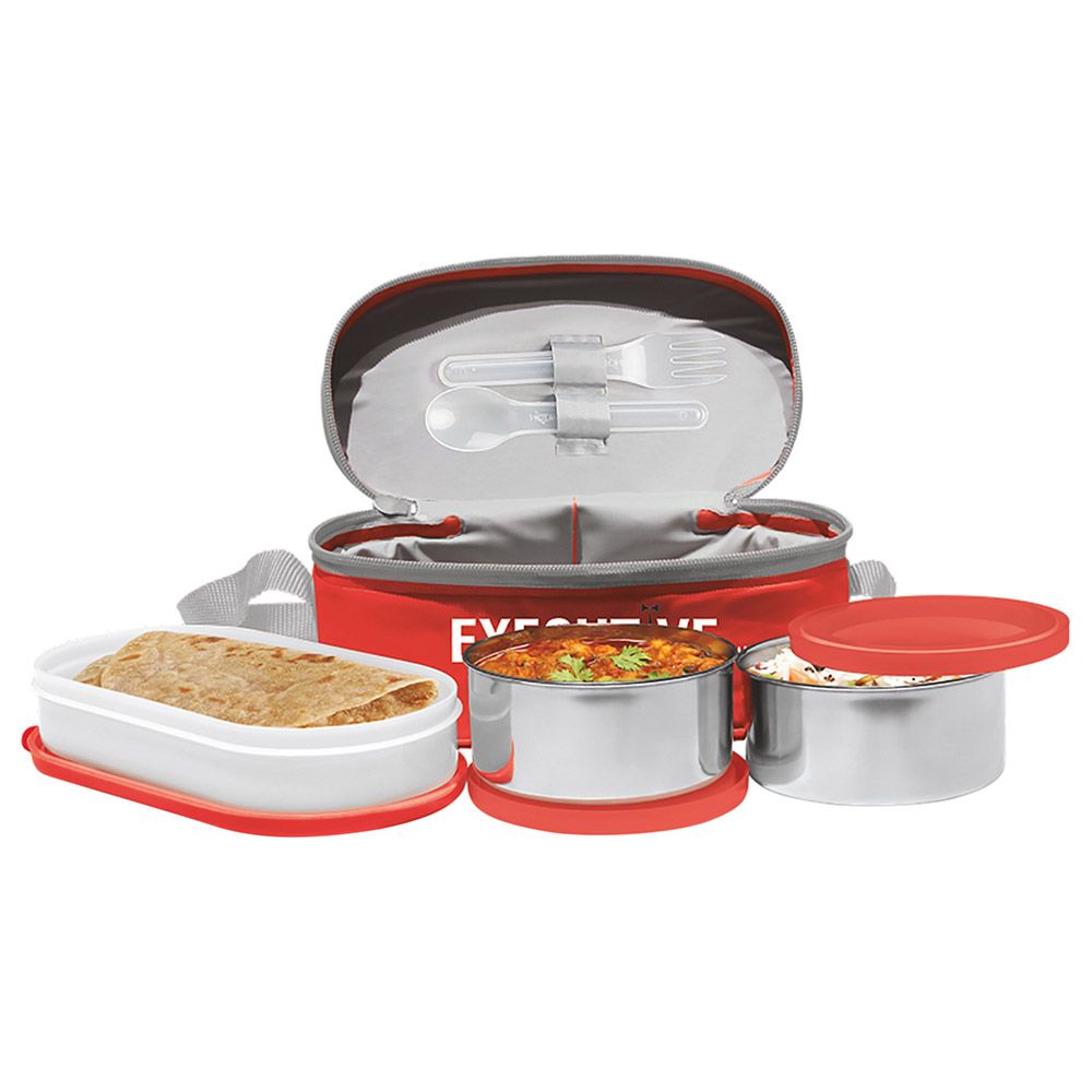 - Material: Stainless Steel and Plastic. Package Content: 1 - Piece Executive lunch Box (2 Round container, 280 ml Each and 1 Oval container,450 ml)