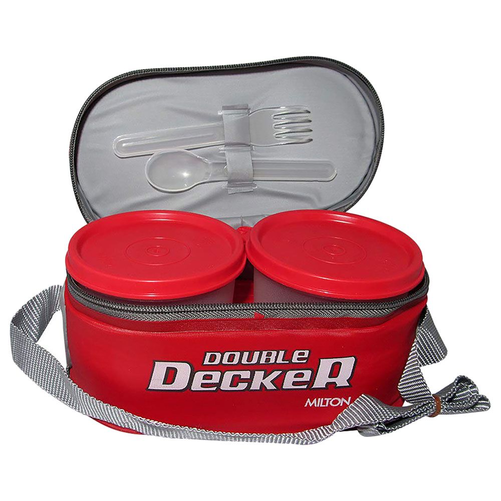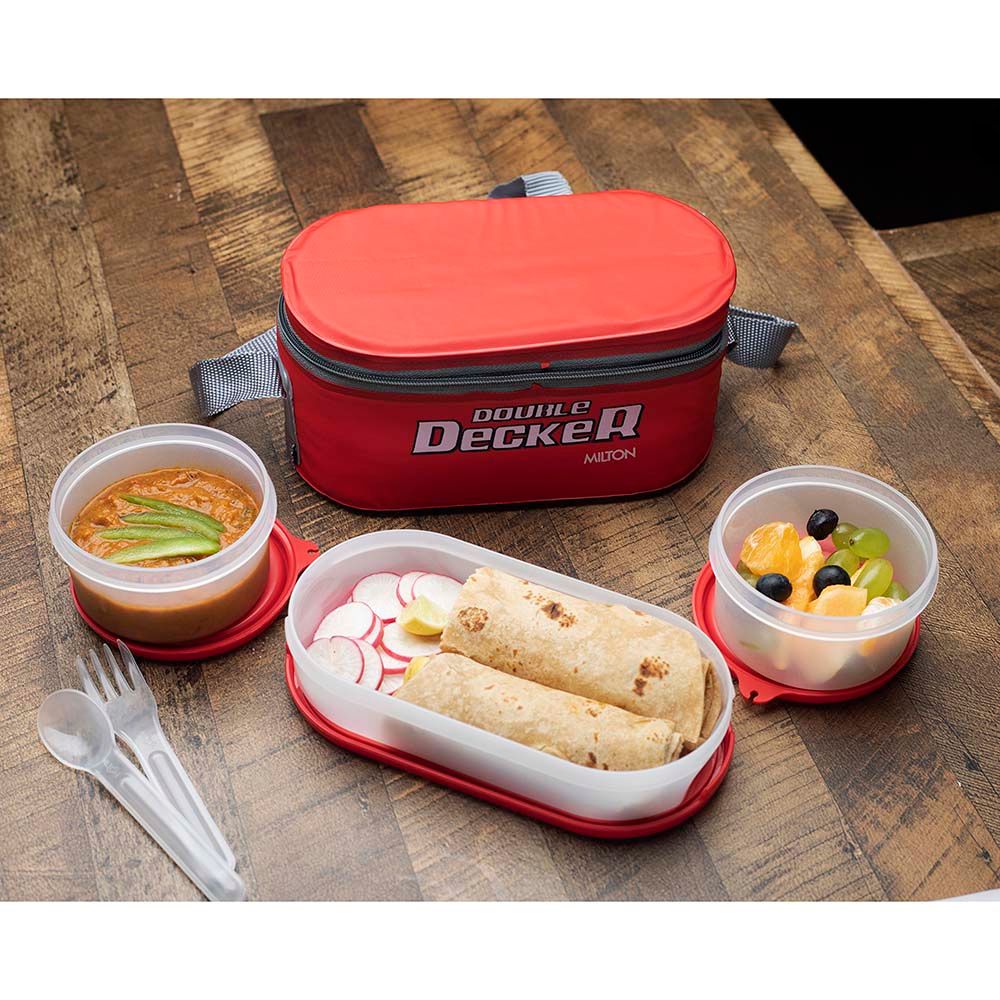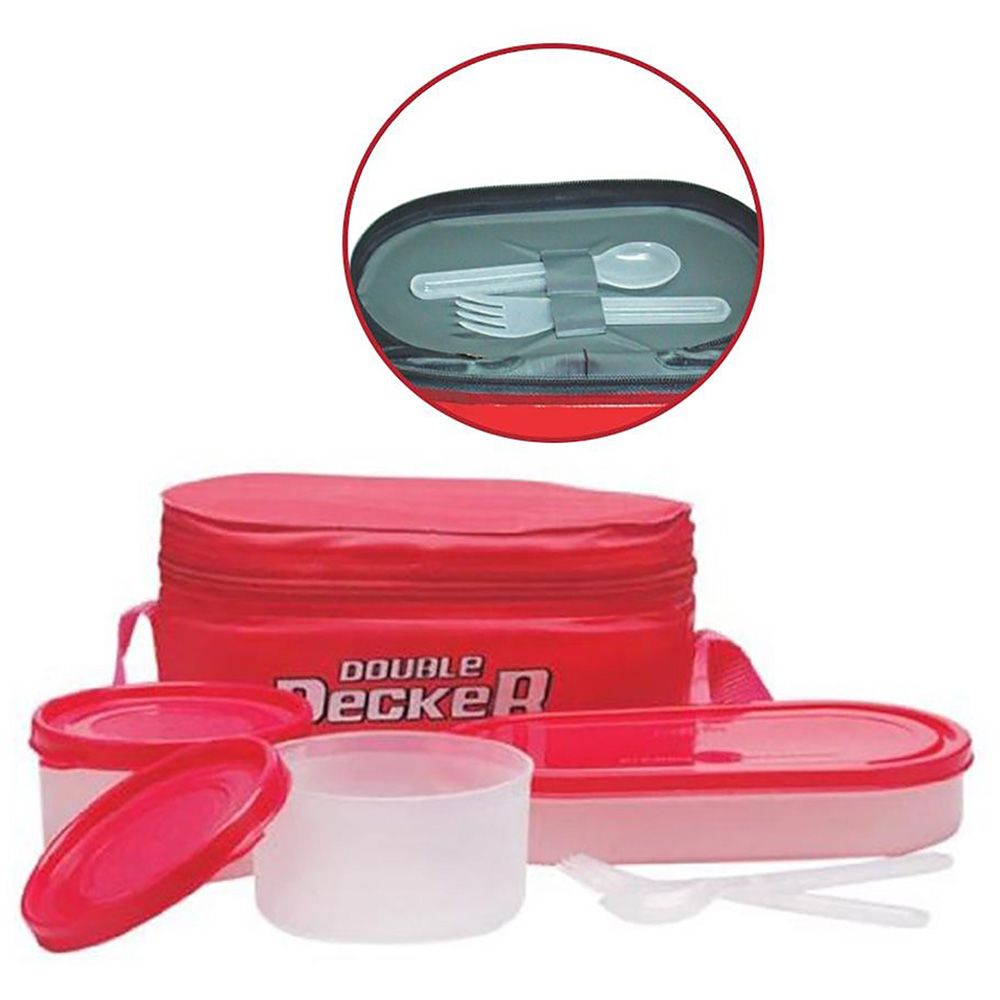 - Material: Plastic. Package Contents: 1 - Piece Double Decker Lunch Box (2 Pc Round container - 280 ml each, 1 Pc Oval container - 420 ml, 1 Pc Plastic spoon,1 Pc Fork)