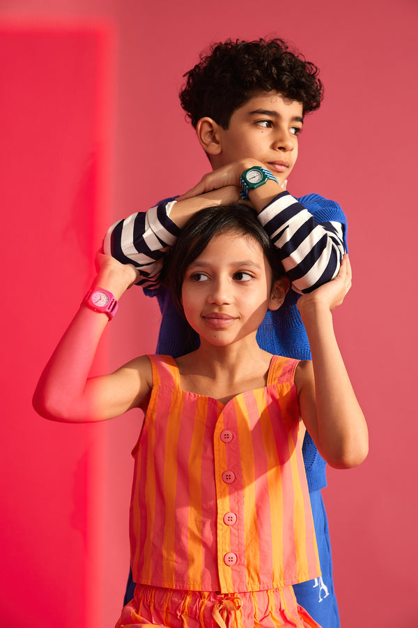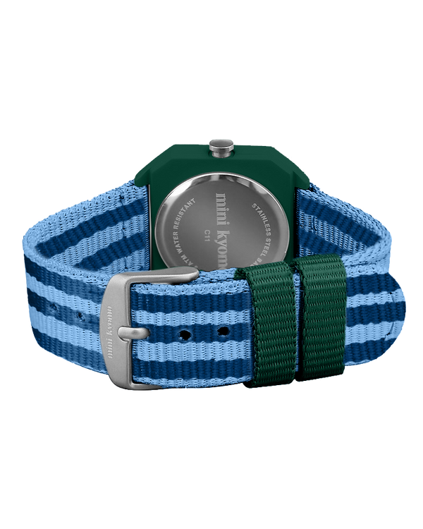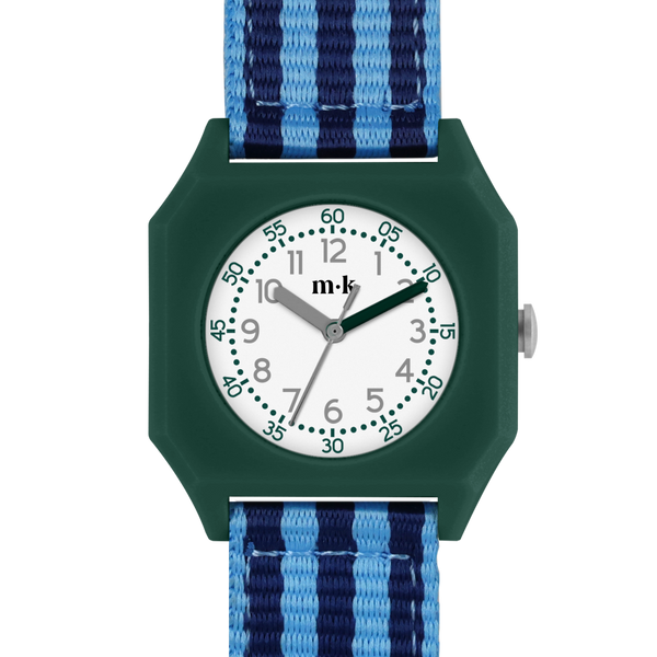 Like all our watches, is equipped with a Japanese movement and a mineral glass. In order to support adventure and play, it is also waterproof. The watch has clearly readable dials with strong color contrast to make learning to read time an easy task. All hours and five-minute steps are written out, the minutes in-between are marked with small dots.