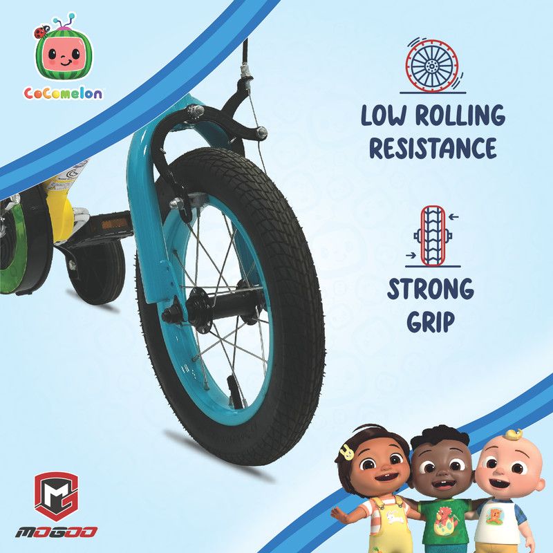 With an adjustable seat featuring a quick-release mechanism and sturdy training wheels, this bike grows with your child and supports their learning journey. The low-resistance tires offer excellent grip for a smoother ride, and the front plate with colorful Cocomelon graphics adds a fun touch.