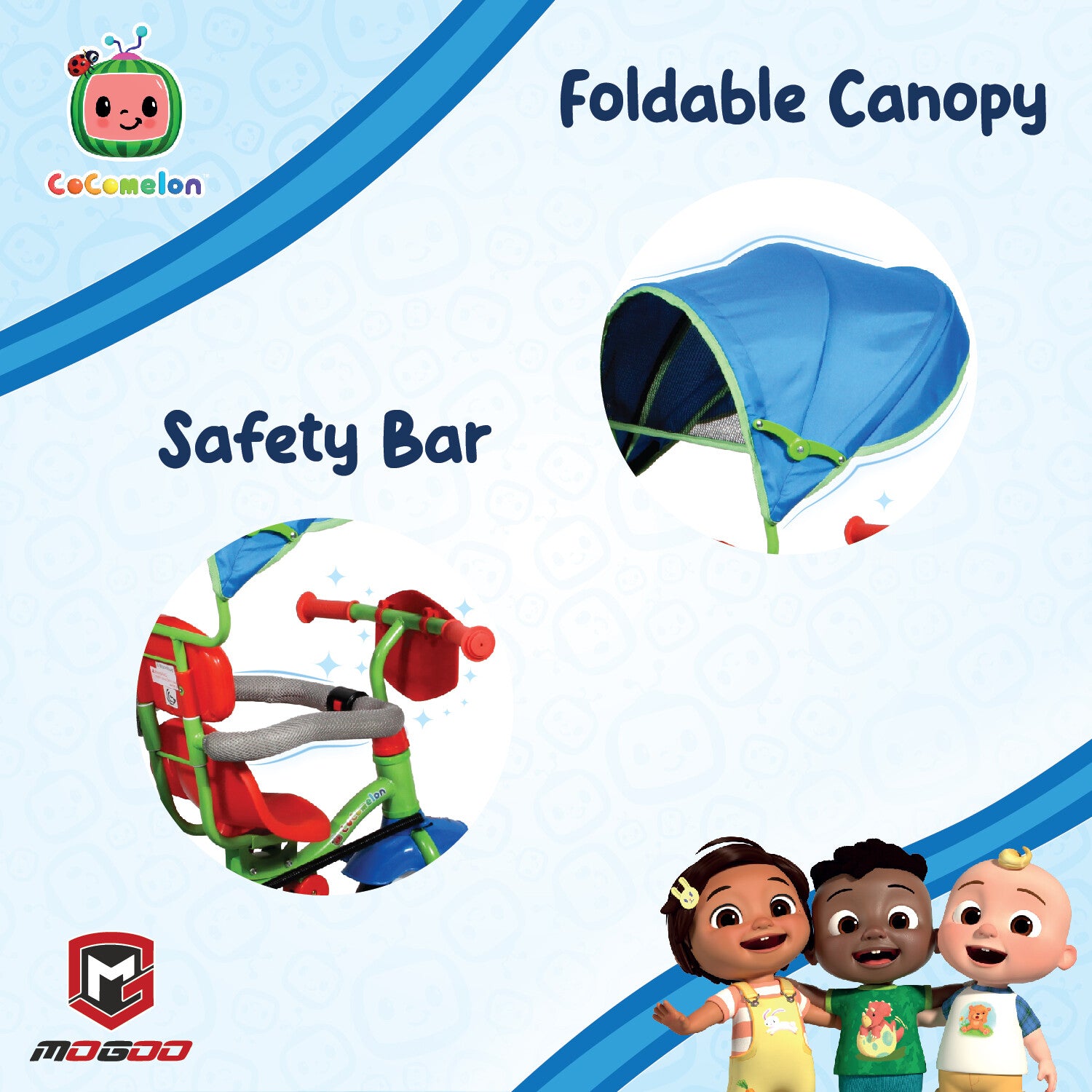 The Mogoo Cocomelon Tricycle is built to provide a safe, comfortable, and fun riding experience for your little one. Featuring a strong steel frame, this tricycle is designed for durability and reliability. The puncture-proof tires ensure smooth, worry-free rides, while the safety bar offers extra protection for your child.For outdoor comfort, the tricycle comes with a foldable canopy, shielding your child from the sun. The ergonomic grip handles offer easy control, and the front plate adds a fun touch for little riders. Parents will love the push handle with steering control, allowing you to guide your child safely while they learn to ride on their own. Itƒ??s the ideal trike for safety, fun, and convenience!