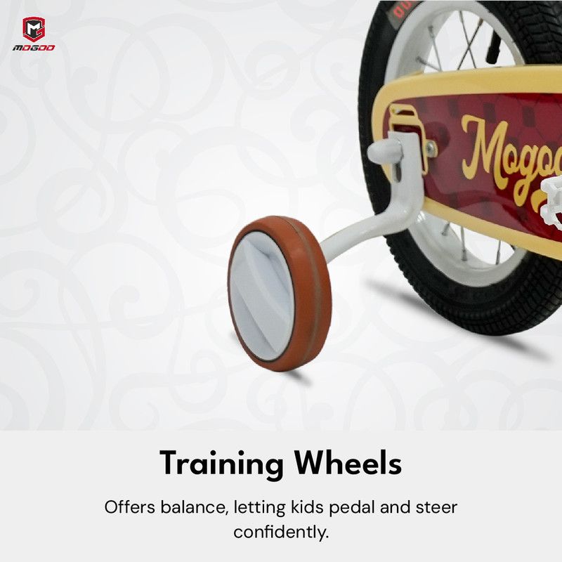 Designed for fun and functionality, the Mogoo Flyer includes a front basket for carrying toys or snacks, and removable side training wheels for beginners learning to balance. A protective chain cover ensures added safety by shielding hands and clothes from the chain.