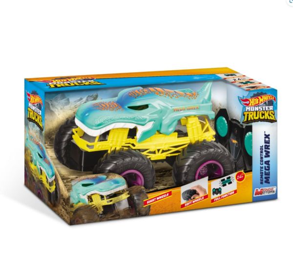 The Hot Wheels Monster Trucks Mega Wrex 2.4GHz. THE baddest trucks ever built for competition and ultimate dominance! Ready to square off in head-to-head battles with their oversized body and GIANT wheels! Every truck package provides stats for each monster truck including name, truck type, strength, unique crash attack and motor-vation for great storytelling fun!