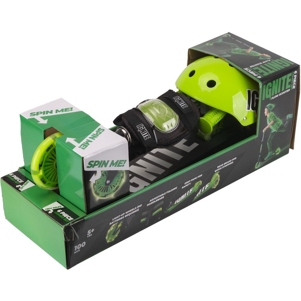 IGNITE FLOW Kids 2 Wheeled Scooter With Safety Pads. LED light-up wheels. Quick release folding and adjustable handlebar height. Lightweight two wheel scooter. Includes helmet, knee and elbow pads.