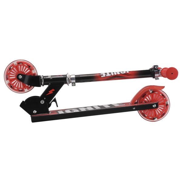 IGNITE FLOW Kids 2 Wheeled Scooter With Safety Pads. LED light-up wheels. Quick release folding and adjustable handlebar height. Lightweight two wheel scooter. Includes helmet, knee and elbow pads.