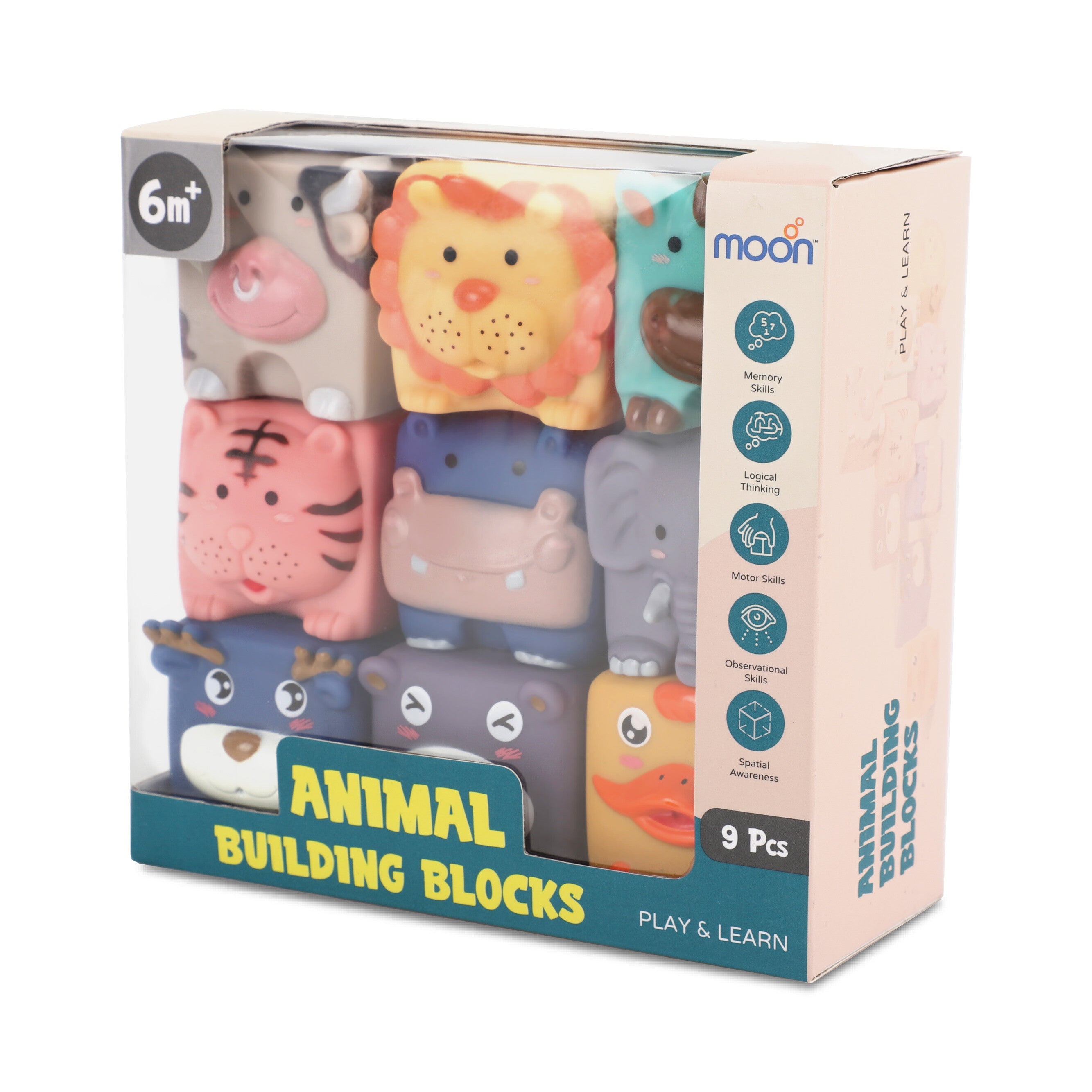 Moon squeezy soft stacking blocks. No heavy wooden blocks to risk your little munchkin's safety! Your infant or toddler will have a blast playing with the MOON building & construction toys for hours, and they will also benefit from many of the features of the set. , , Our baby blocks are made thoughtfully with the highest quality for small and delicate humans. They will have a great time learning about the animals, colors, and numbers featured on each side while stacking and knocking them down safely again and again.