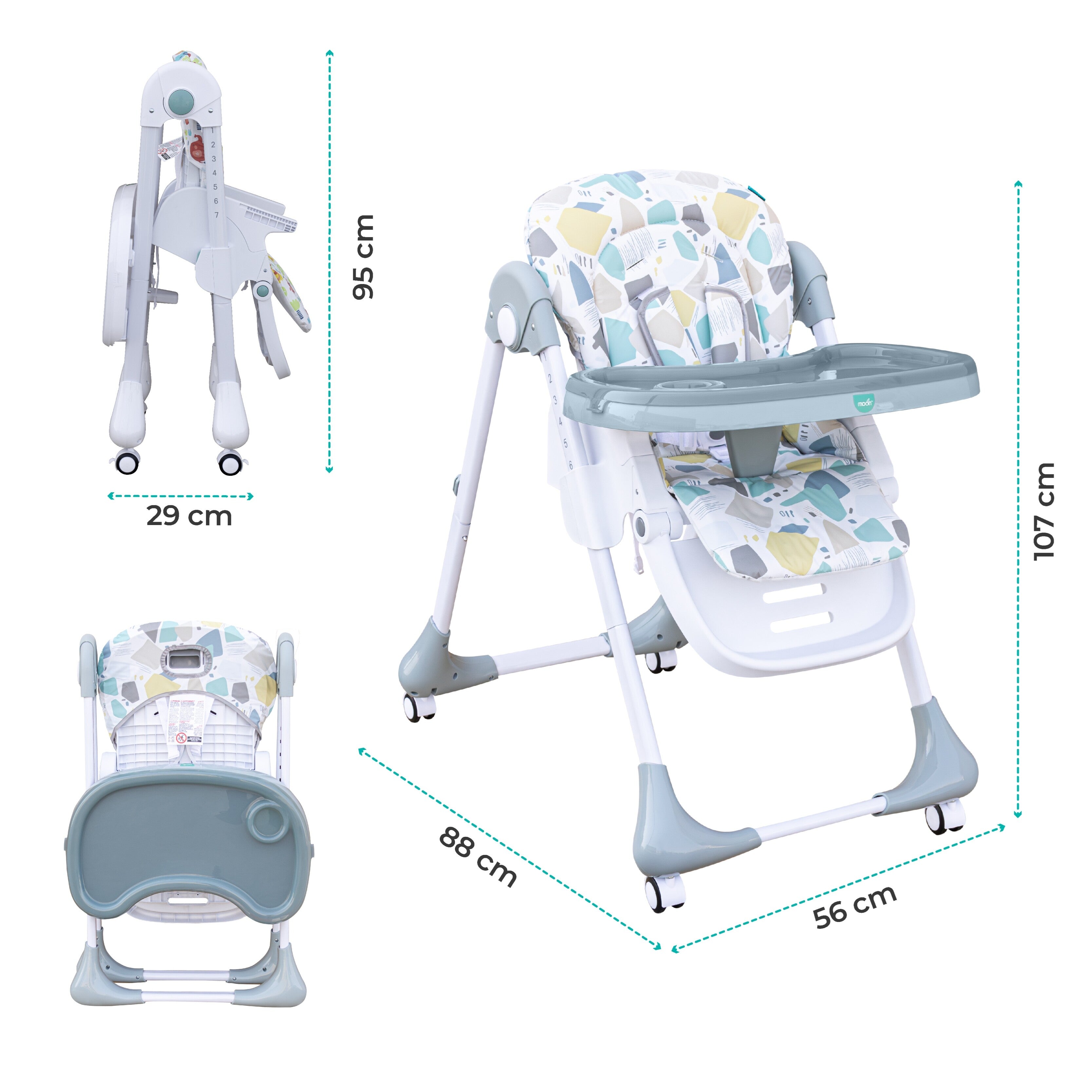 - Safety First: This highchair features a secure harness system to keep your child safe and snug during mealtimes. Plus, its sturdy construction and reliable wheels ensure stability and easy manoeuvrability.