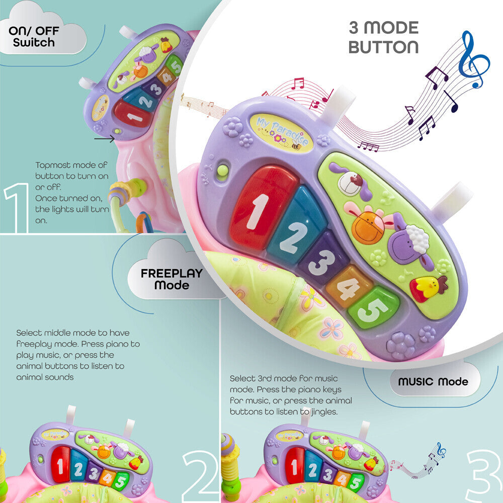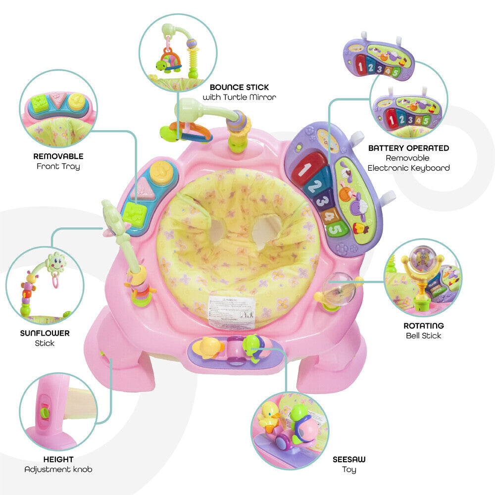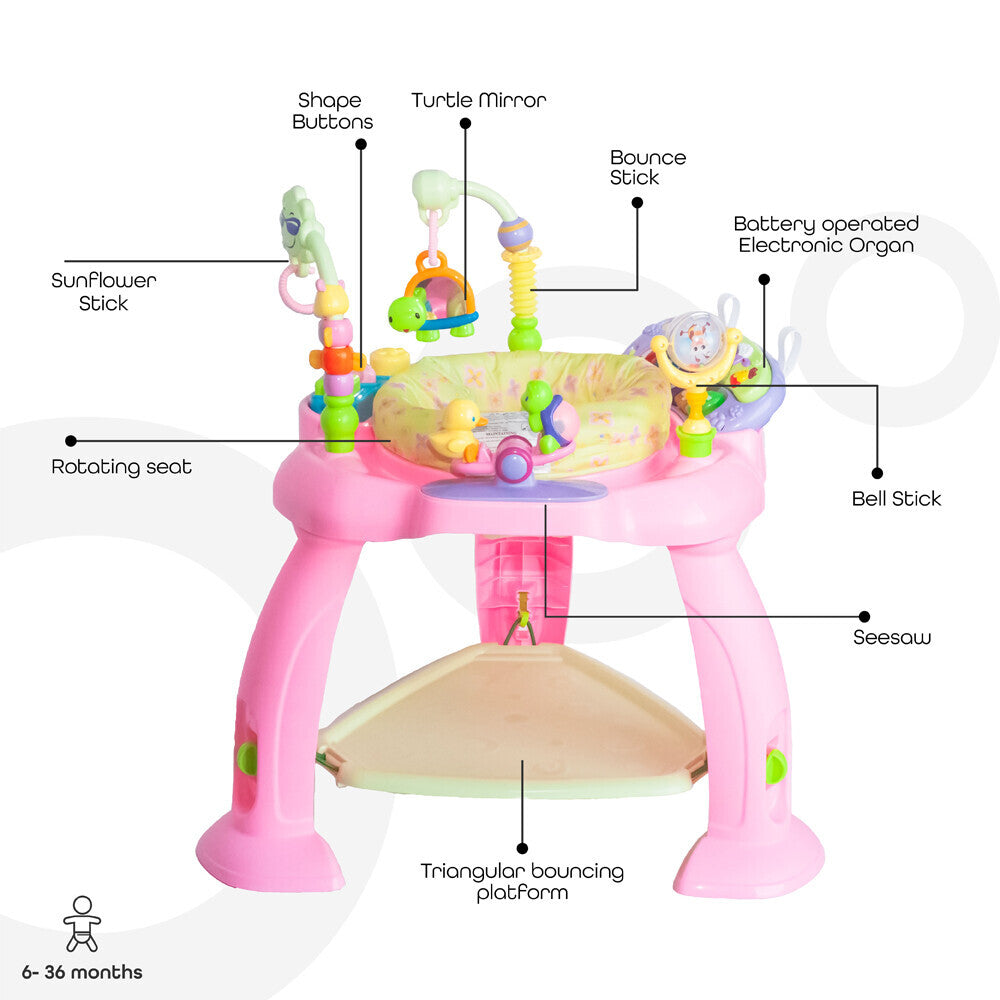 - ACTIVITY CENTRE- The jumper is equipped with multiple fun activities and toys to help your child achieve essential developmental milestones in the most entertaining ways.