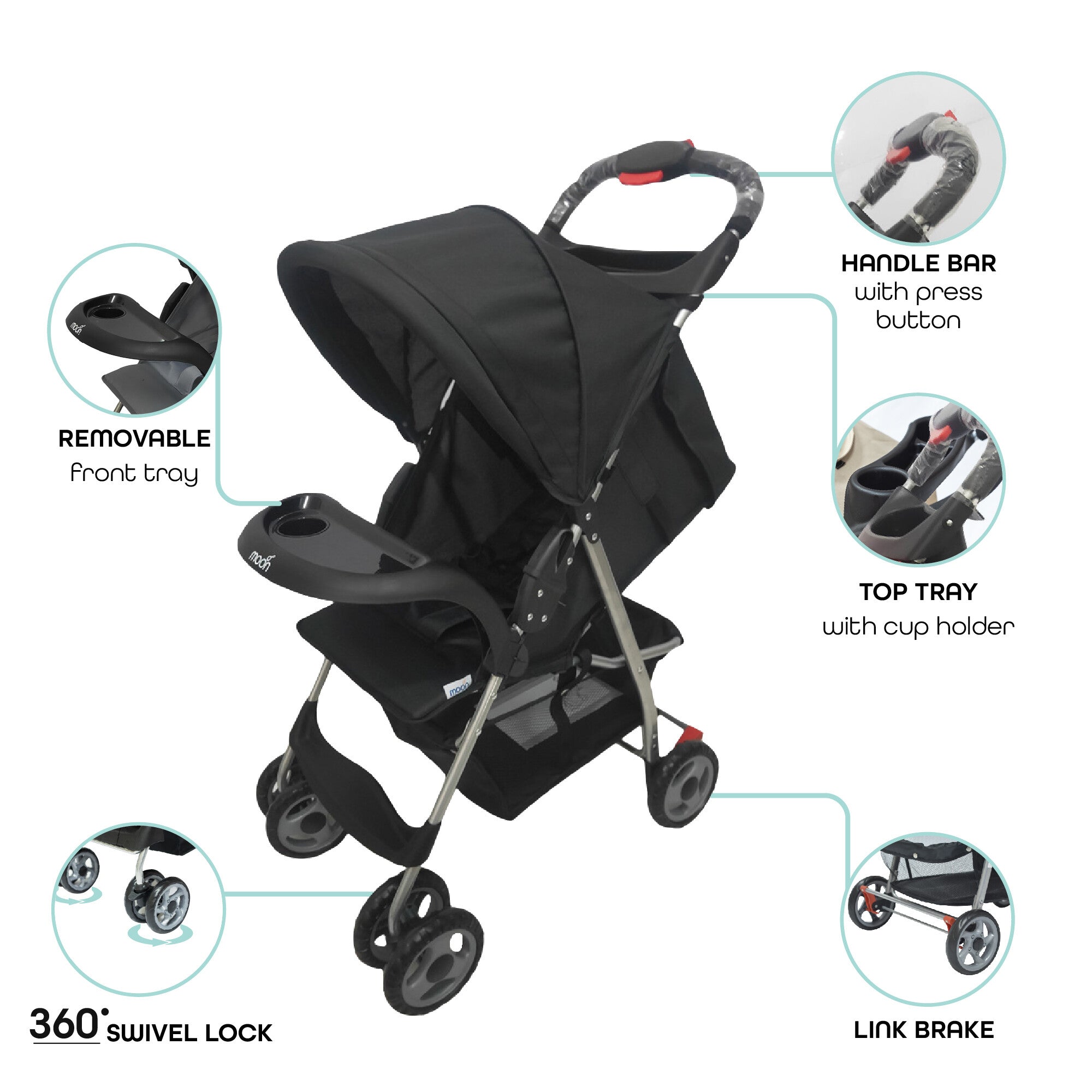- It has rear wheels with brakes for secure movement and front swivel wheels with fixers to provide easy and smooth movement of the stroller.