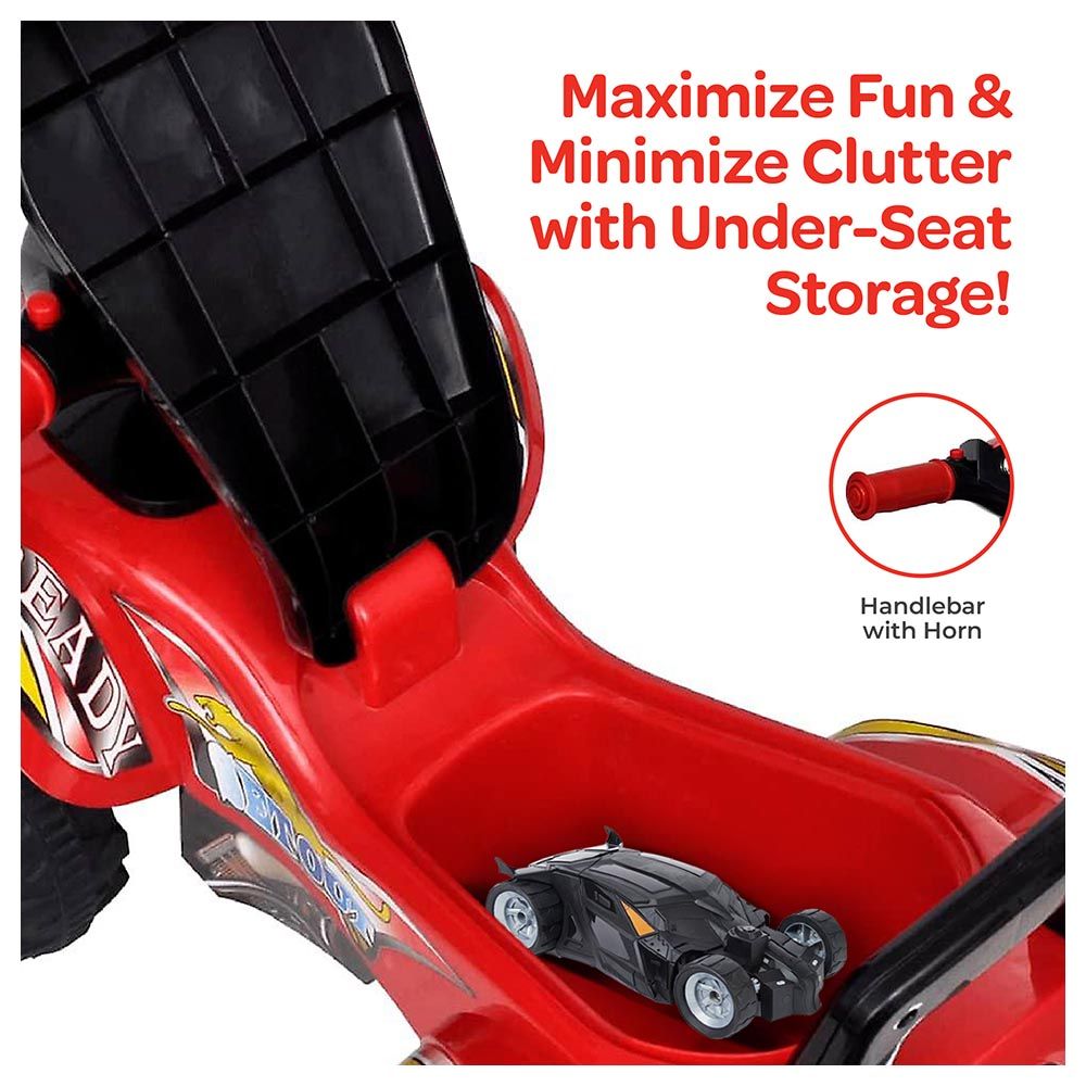 - Convenient and Practical: This quad bike is equipped with under-seat storage, allowing kids to carry their toys or snacks during their adventures. The frame handlebar with a horn adds a touch of realism, enhancing their imaginative play.