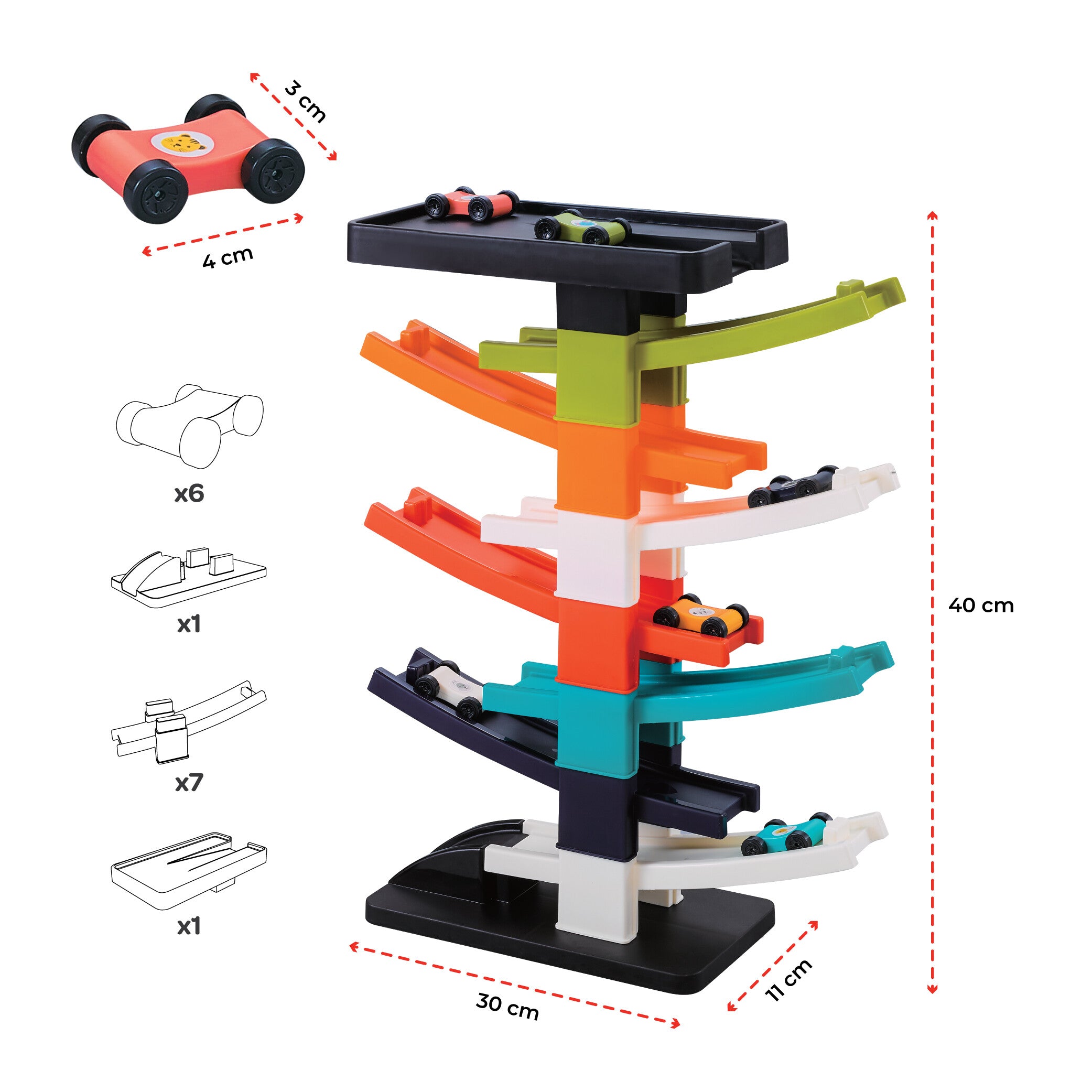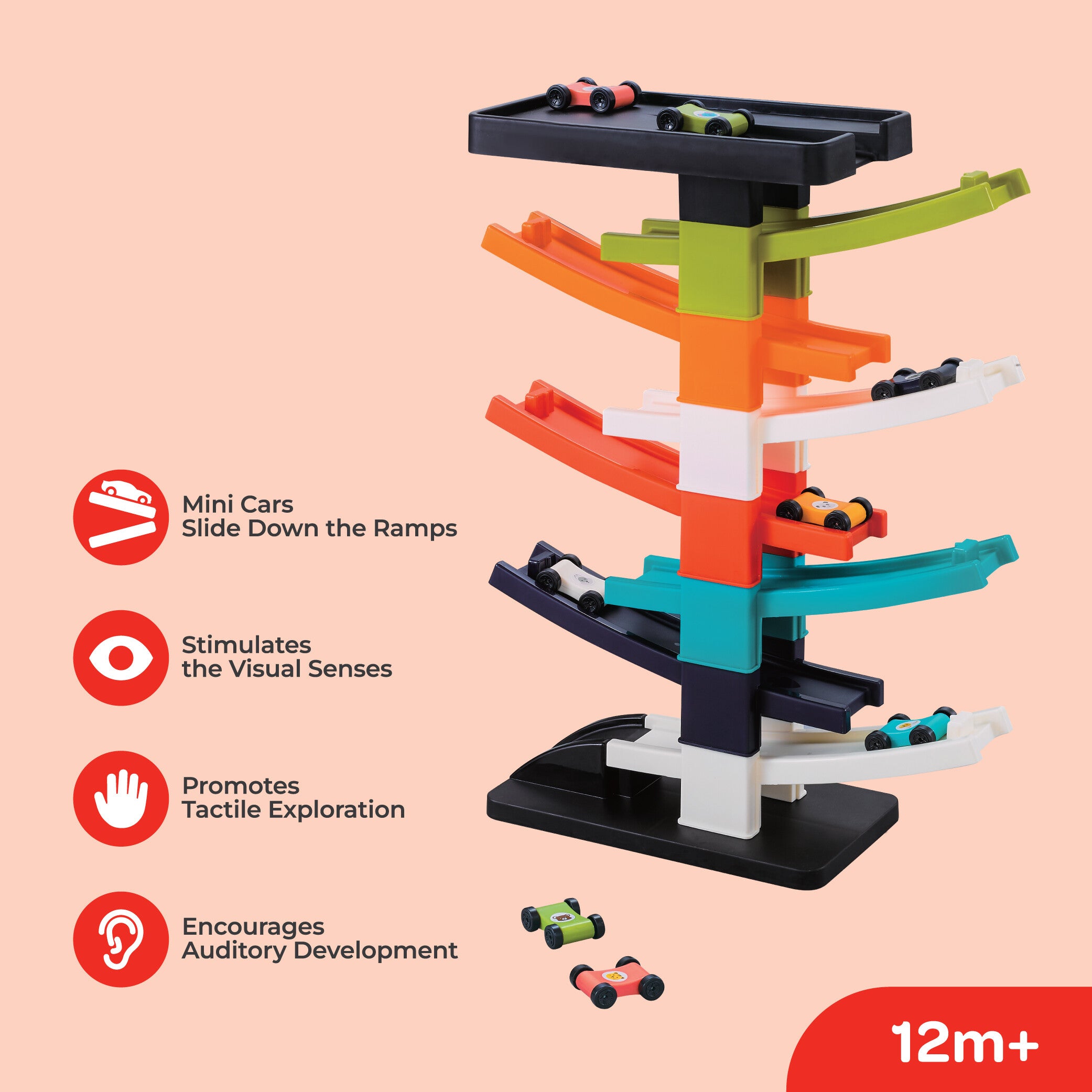 This Car Ramp Racer offers much more than just entertainment. Crafted with safe and secure BPA free materials -With its vibrant colors, engaging racetracks, and sliding cars, it becomes a catalyst for your child's development. Designed for children aged 18 to 36 months, it nurtures their observation skills, imagination, and social interaction. As they explore the different ramps, experiment with car speed, and overcome challenges, their cognitive and motor skills thrive.