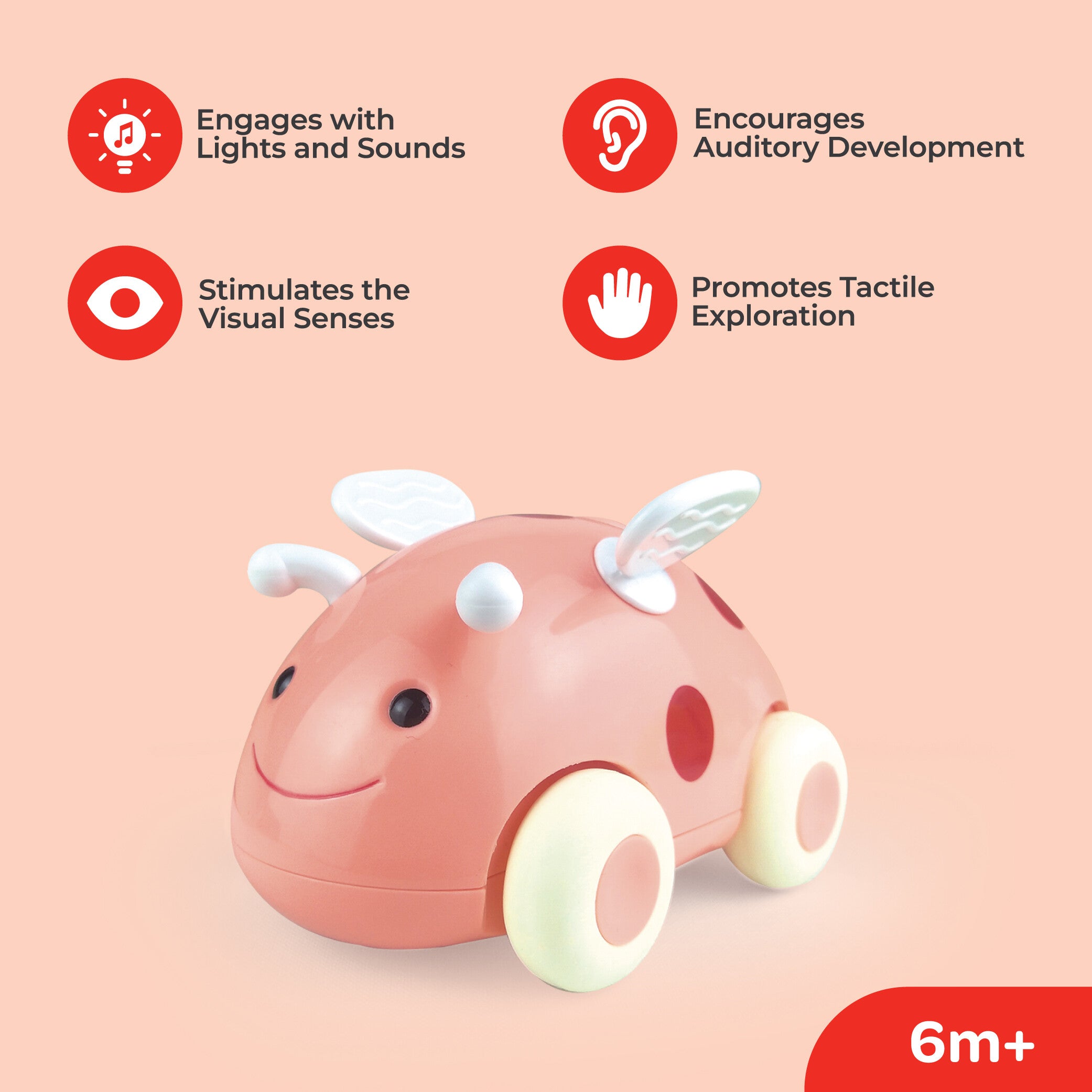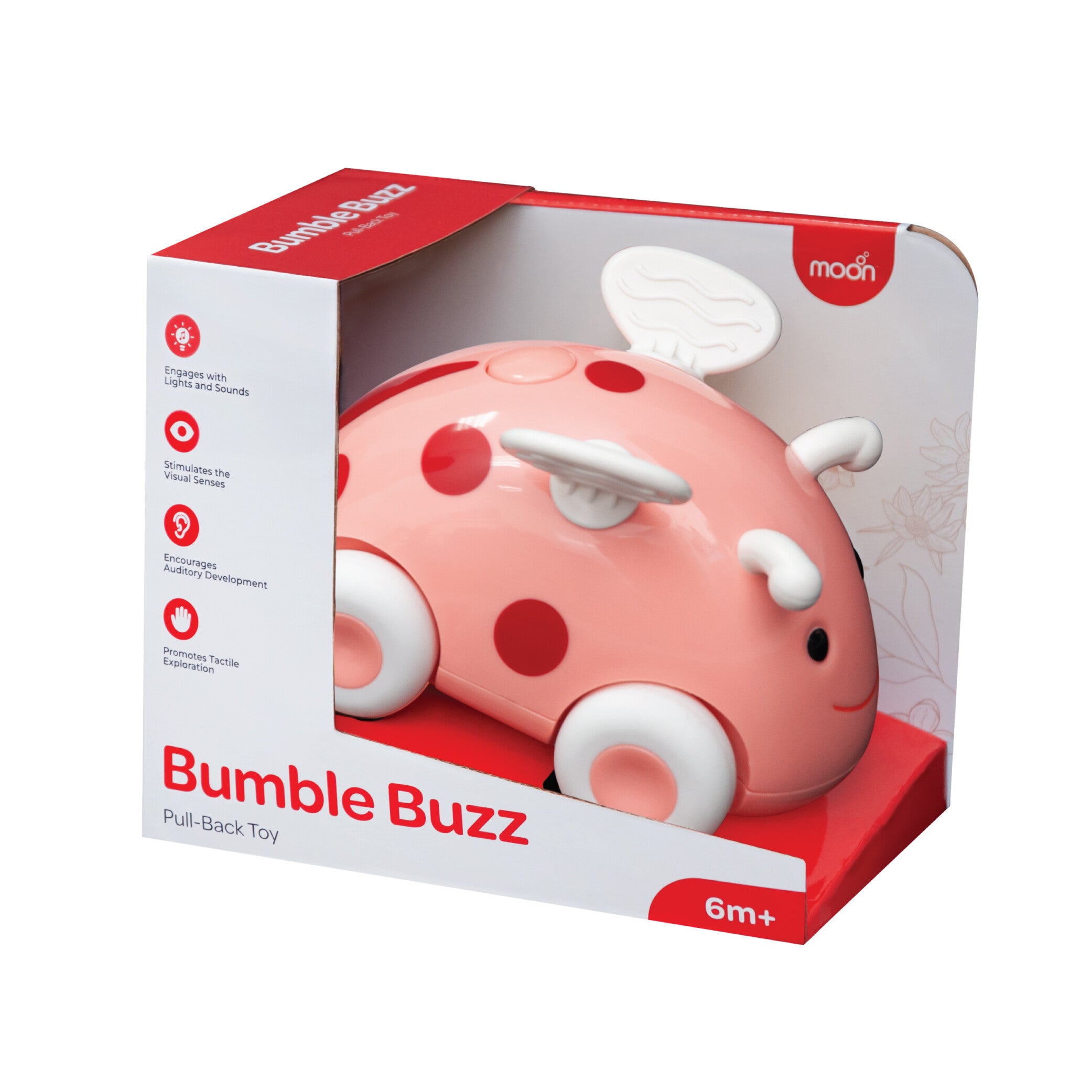 Moon Bumble Buzz Pull Back Rolling Toy: Unleash the Buzzing Fun and Learning! Ignite your child's imagination and promote their development with the Bumble Buzz Pull Back Rolling Toy. Designed to captivate their attention, this toy combines engaging features, lights, and music to create an exciting sensory experience crafted with safe and secure BPA materials. Watch as they pull it back, release, and see it zoom forward with delight!