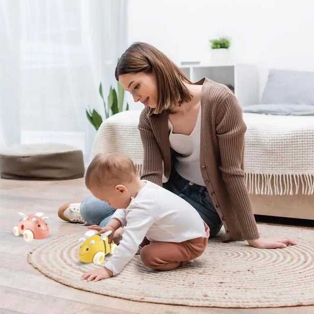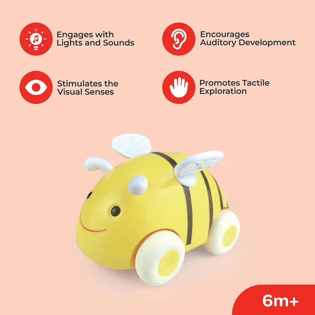 Moon Bumble Buzz Pull Back Rolling Toy: Unleash the Buzzing Fun and Learning! Ignite your child's imagination and promote their development with the Bumble Buzz Pull Back Rolling Toy. Designed to captivate their attention, this toy combines engaging features, lights, and music to create an exciting sensory experience crafted with safe and secure BPA materials. Watch as they pull it back, release, and see it zoom forward with delight!