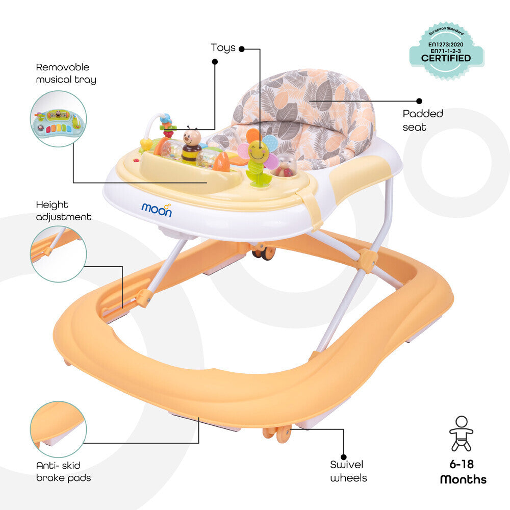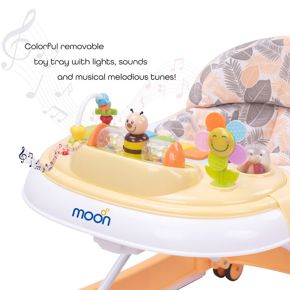 - Perfect Companion-Moon walker provides ideal support for your baby during their growing up phase. It comes with a removable music box and rotating wheels for the child's entertainment.