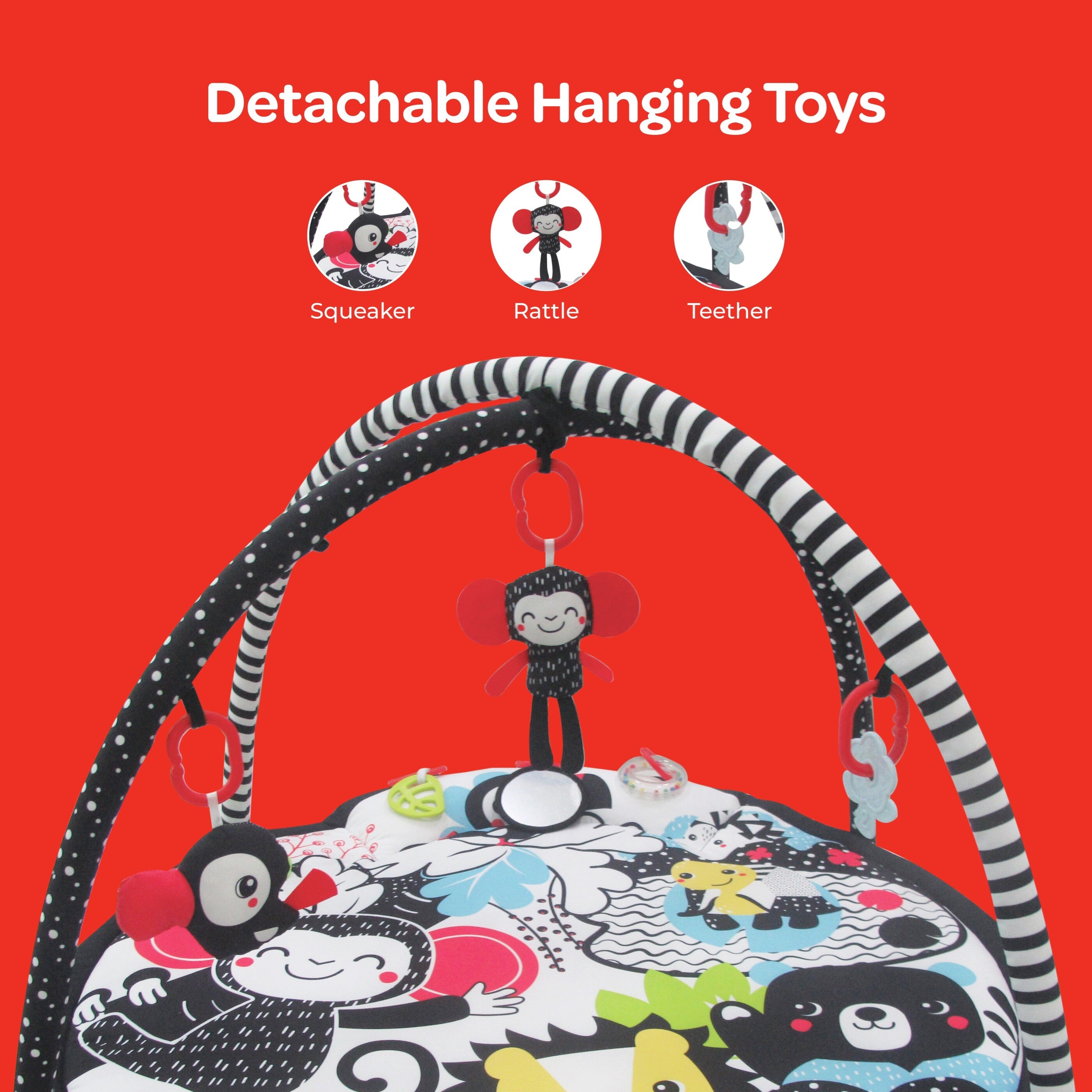 - Perfect for Tummy Time: Promote healthy development with tummy time on the soft and supportive mat. The arches provide eye coordination opportunities while the teether, rattle, and other toys encourage reaching, grasping, and fine motor skills.