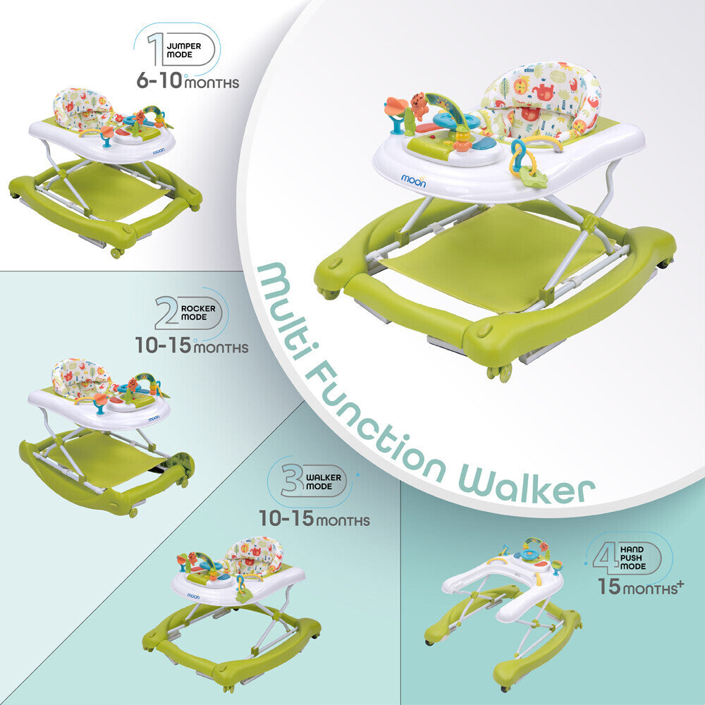 Watching your baby walk is one of the most special and thoroughly awaited times in the life of a parent. With the Moon 4-in-1 walker, you can help your child learn how to walk by providing them additional stability. We have designed the walker such that your baby can use it from 6 months upto 15 months and more, in 4 different modes (walker, jumper, rocker, and a pushable walker). You can adjust the walker depending upon your requirement.