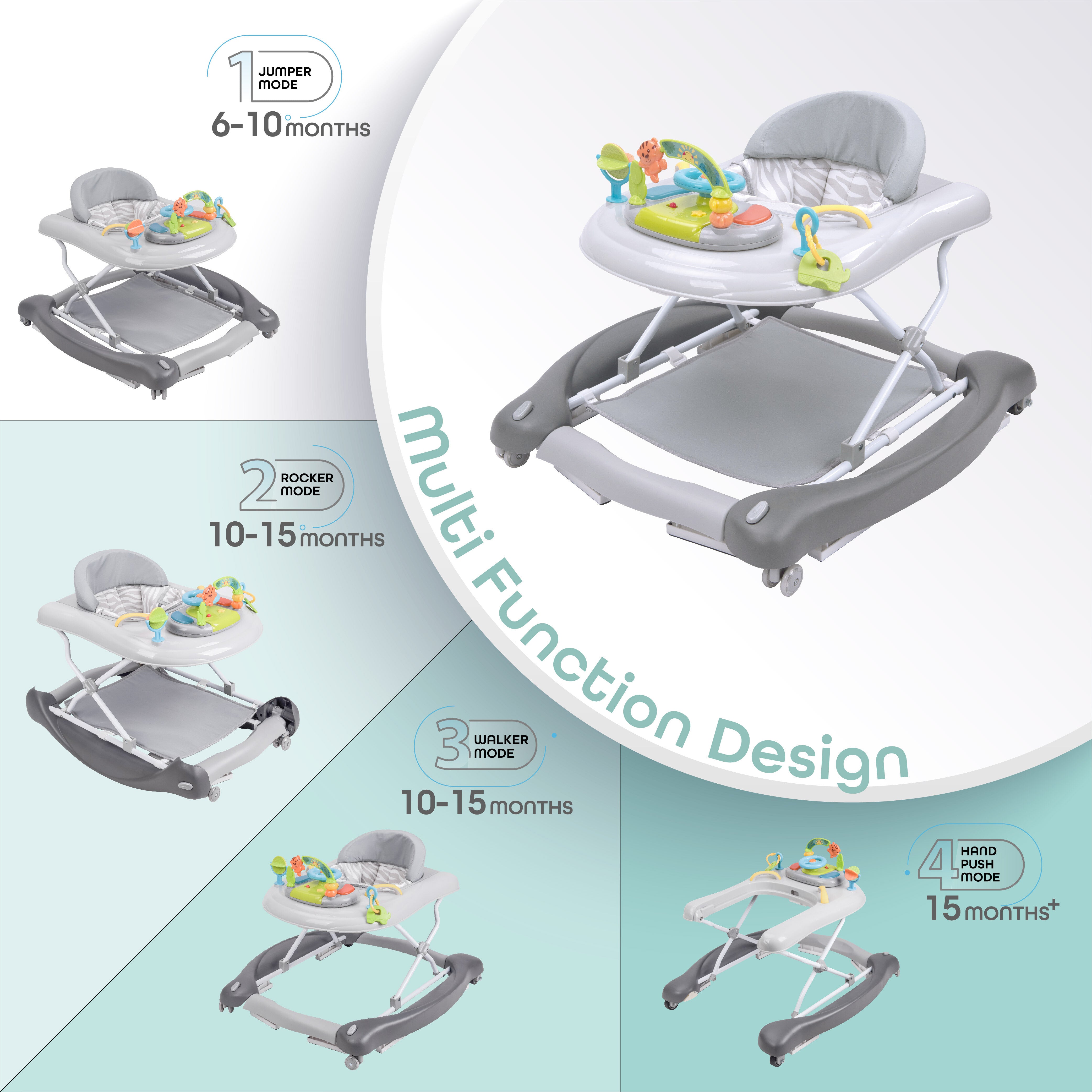 Watching your baby walk is one of the most special and thoroughly awaited times in the life of a parent. With the Moon 4-in-1 walker, you can help your child learn how to walk by providing them additional stability. We have designed the walker such that your baby can use it from 6 months upto 15 months and more, in 4 different modes (walker, jumper, rocker, and a pushable walker). You can adjust the walker depending upon your requirement.