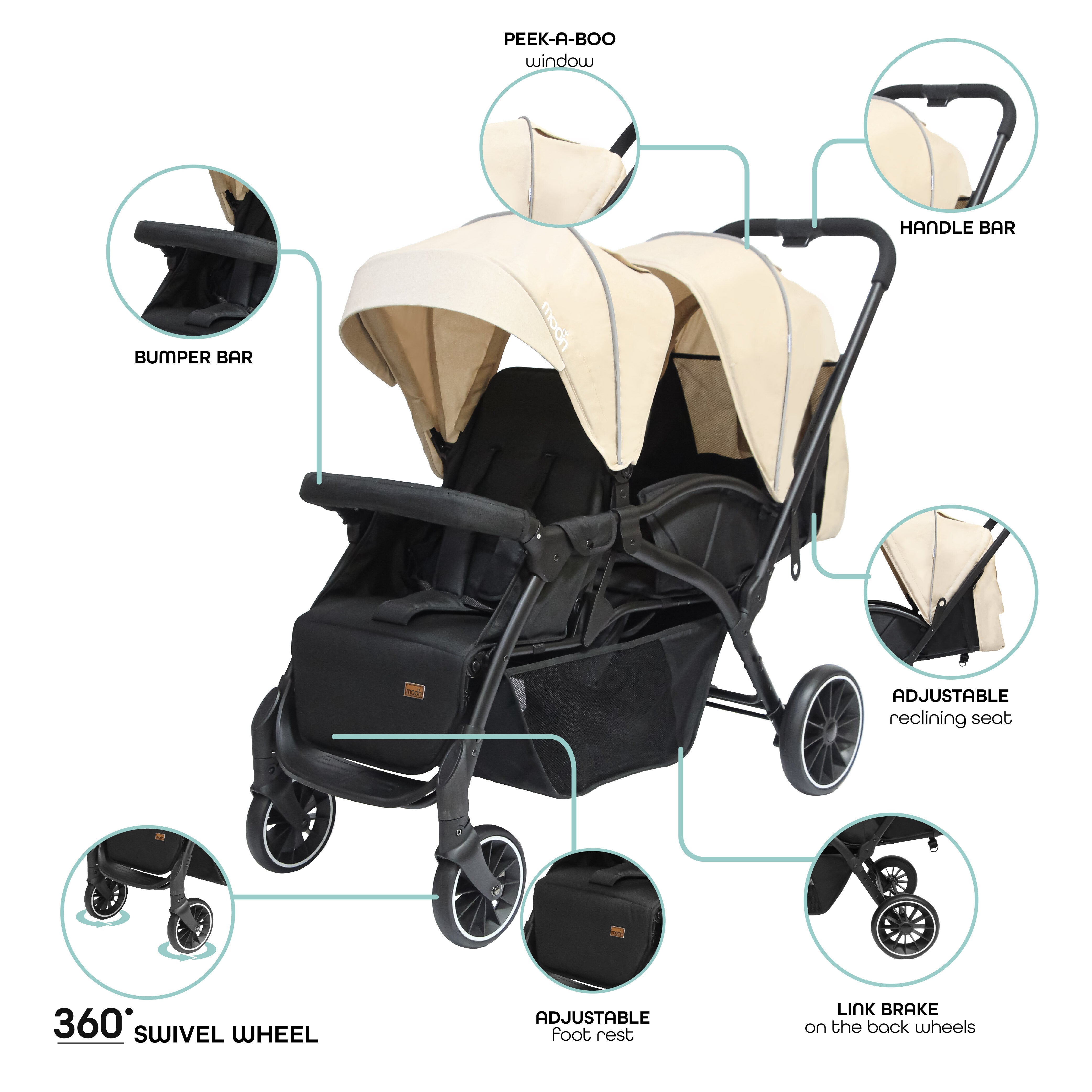 - A Twin Solution: Stroll around with your twins in style! MOON Dois is the answer to the prayers of every twin parent. With its intuitive design, we at The MOON store team spared no effort to make this baby trolley comfortable for little ones and user-friendly for parents