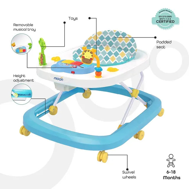 The baby learning walker features playful sounds and toys in the front tray, in a variety of colours, much to the enjoyment of your child. The walker'ss height is adjustable and hence, convenient.