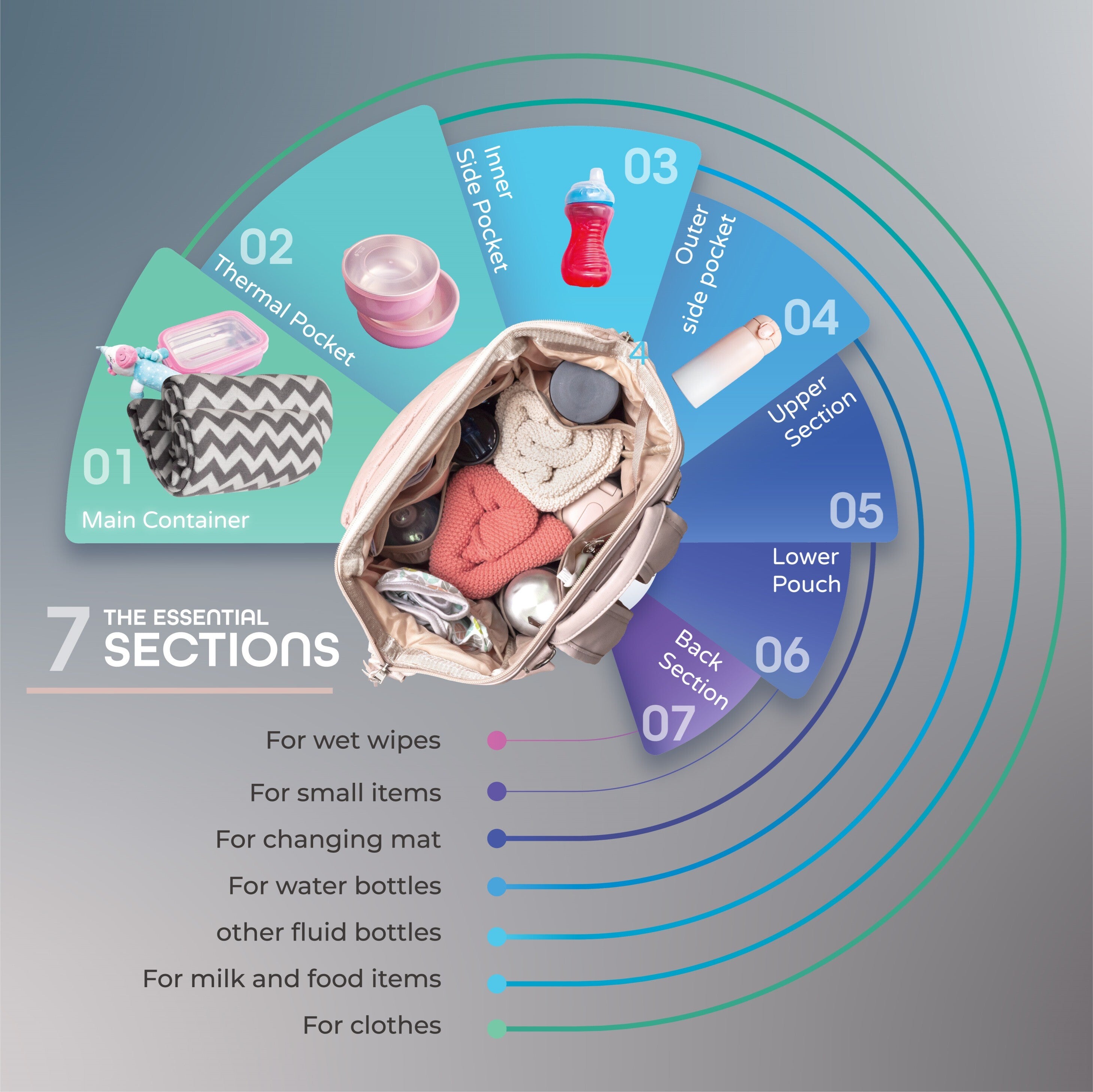 - MULTIPLE POCKETS- Along with several pockets inside, the NUTRA comes with a multiple pocketed front compartment, a privacy pocket, a wipes pocket, and side pockets on the outside.