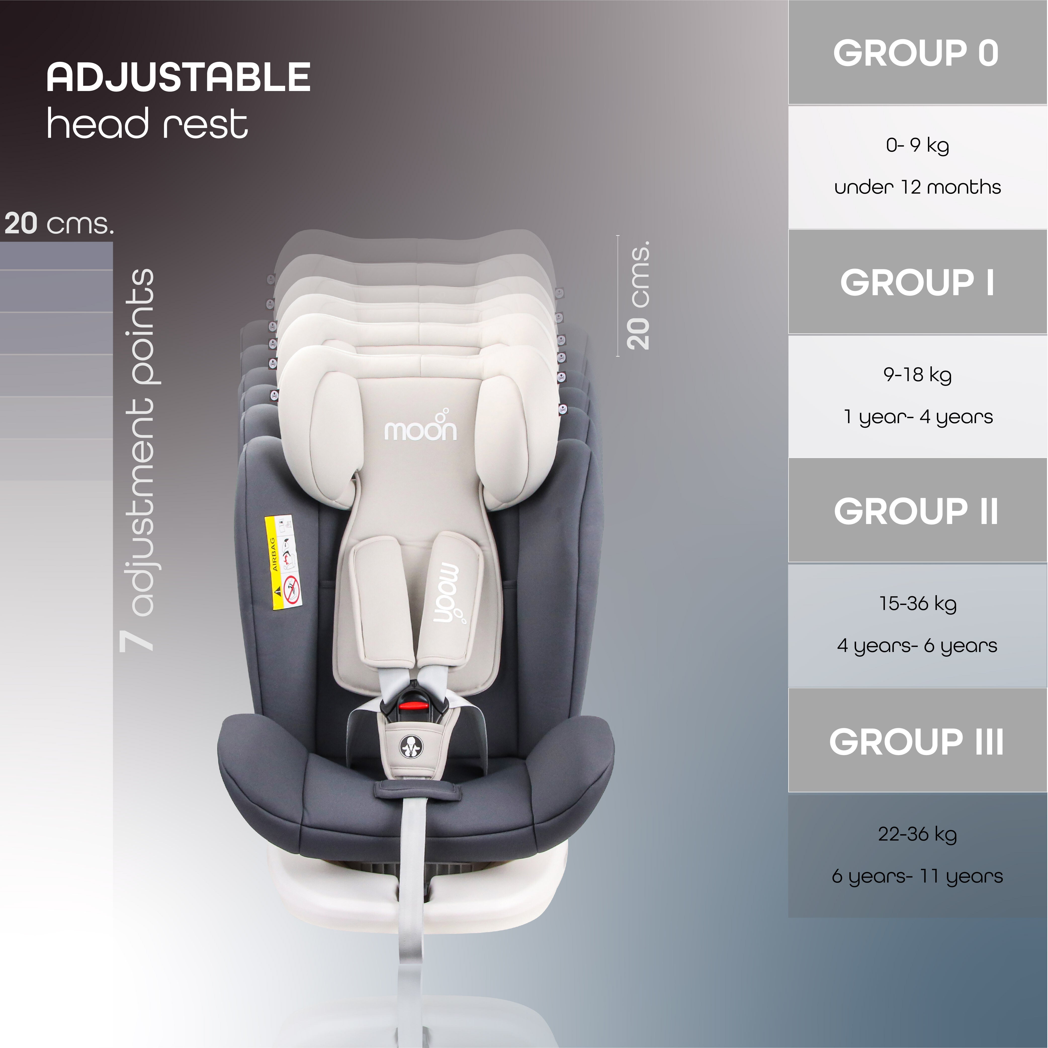 Suitable for group 0+123 with weight capacity of 0-36kg , Headrest adjustable to 7 heights