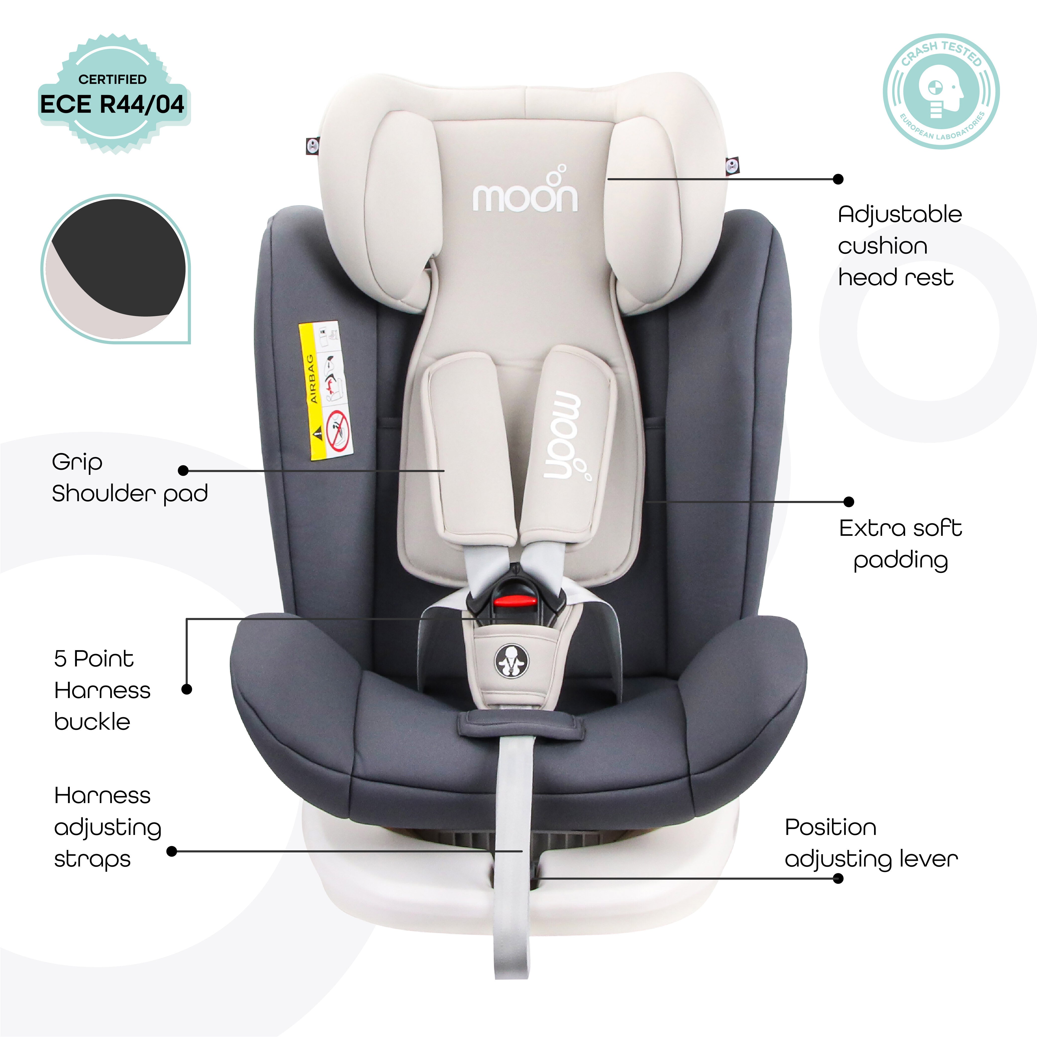 - Absolute Comfort: Put an end to your kid's discomfort on car rides with MOON Gyro - A 360-degree rotatable, rear and forward convertible, reclining, growing, fiercely protective, and extremely stylish baby booster seat that is a marvel in the realm of child safety and luxury