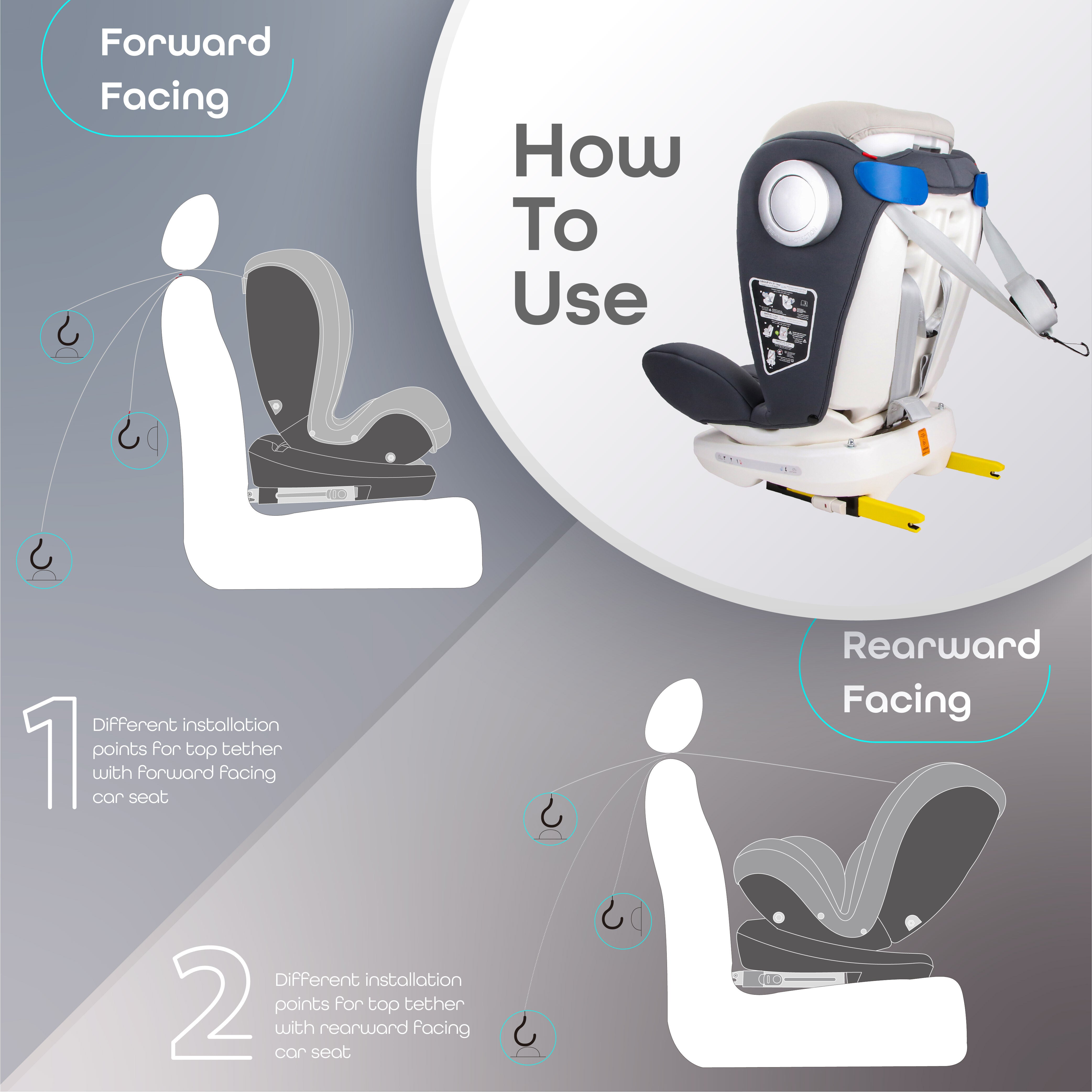 Install with Isofix, seatbelt, or the tether strap with car seat 360-degree rotation