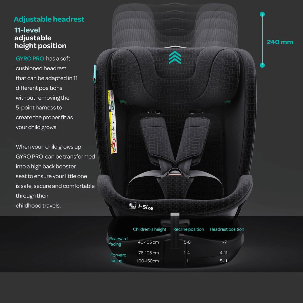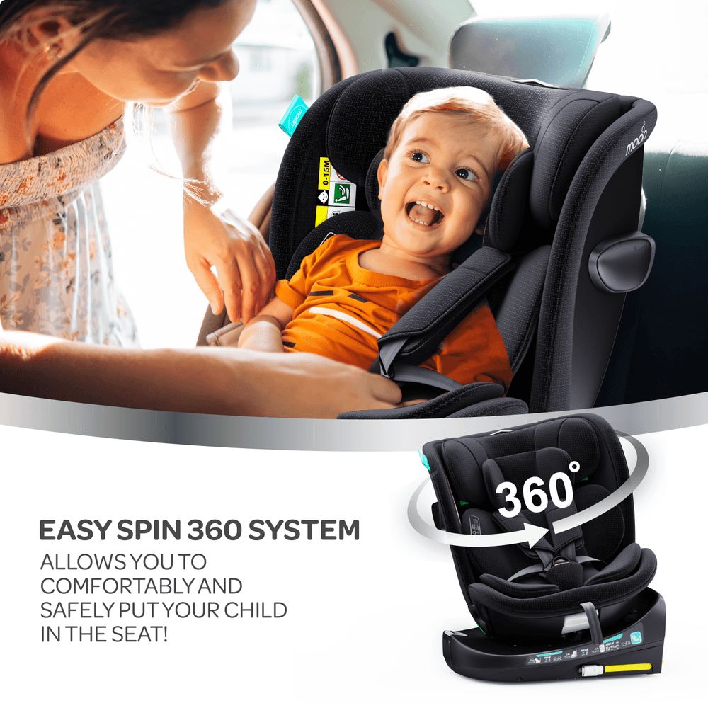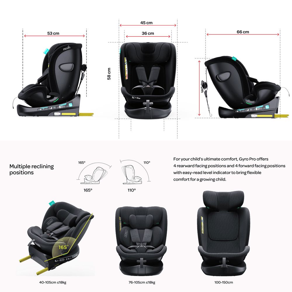 MOON Gyro Pro i-Size 360 degree Rotating Car Seat for Growing Kids. The MOON Gyro Pro Car Seat is engineered to meet the highest European safety standards, featuring the latest R129 i-Size certification. Designed to protect your child from birth to 12 years, it offers maximum safety and comfort at every stage.
