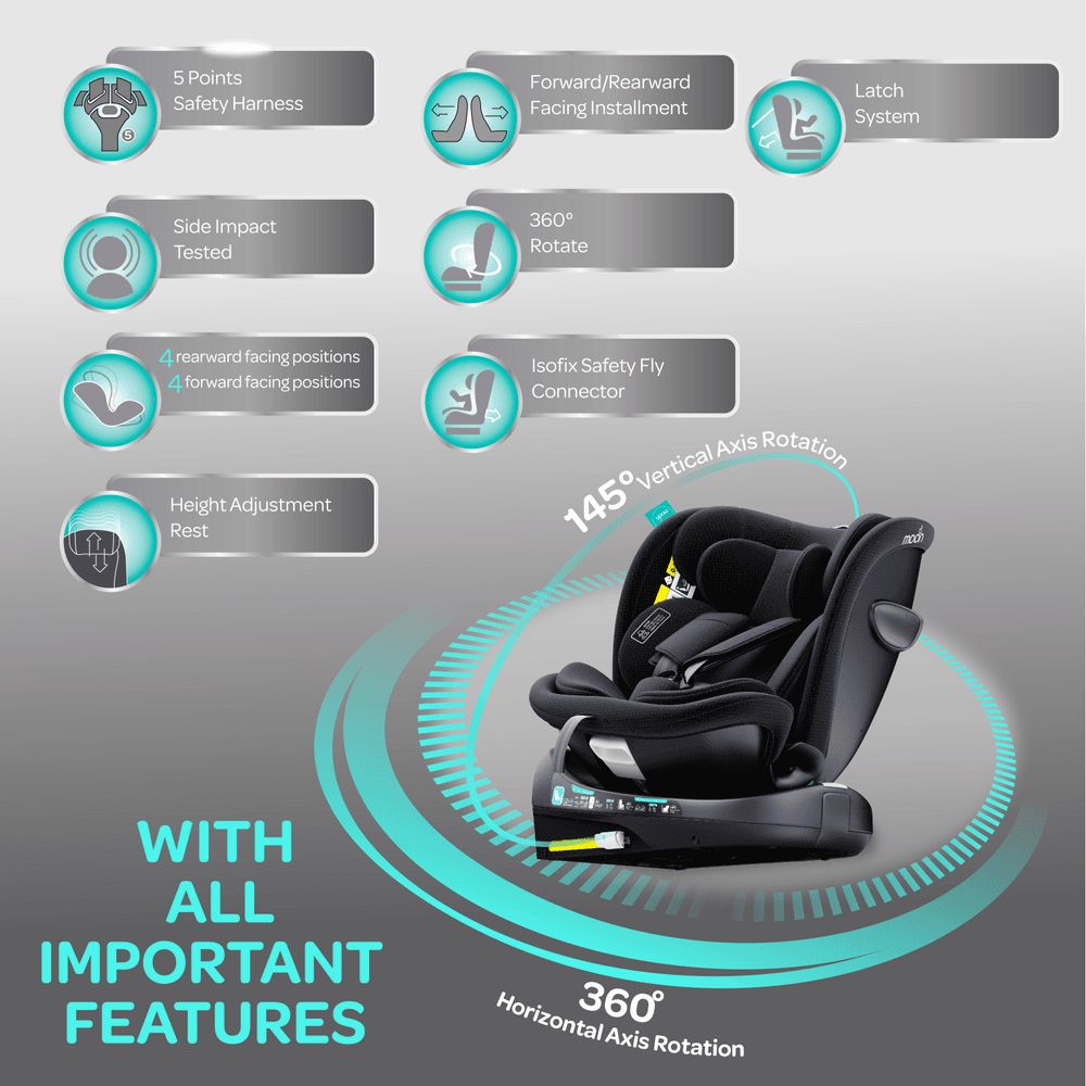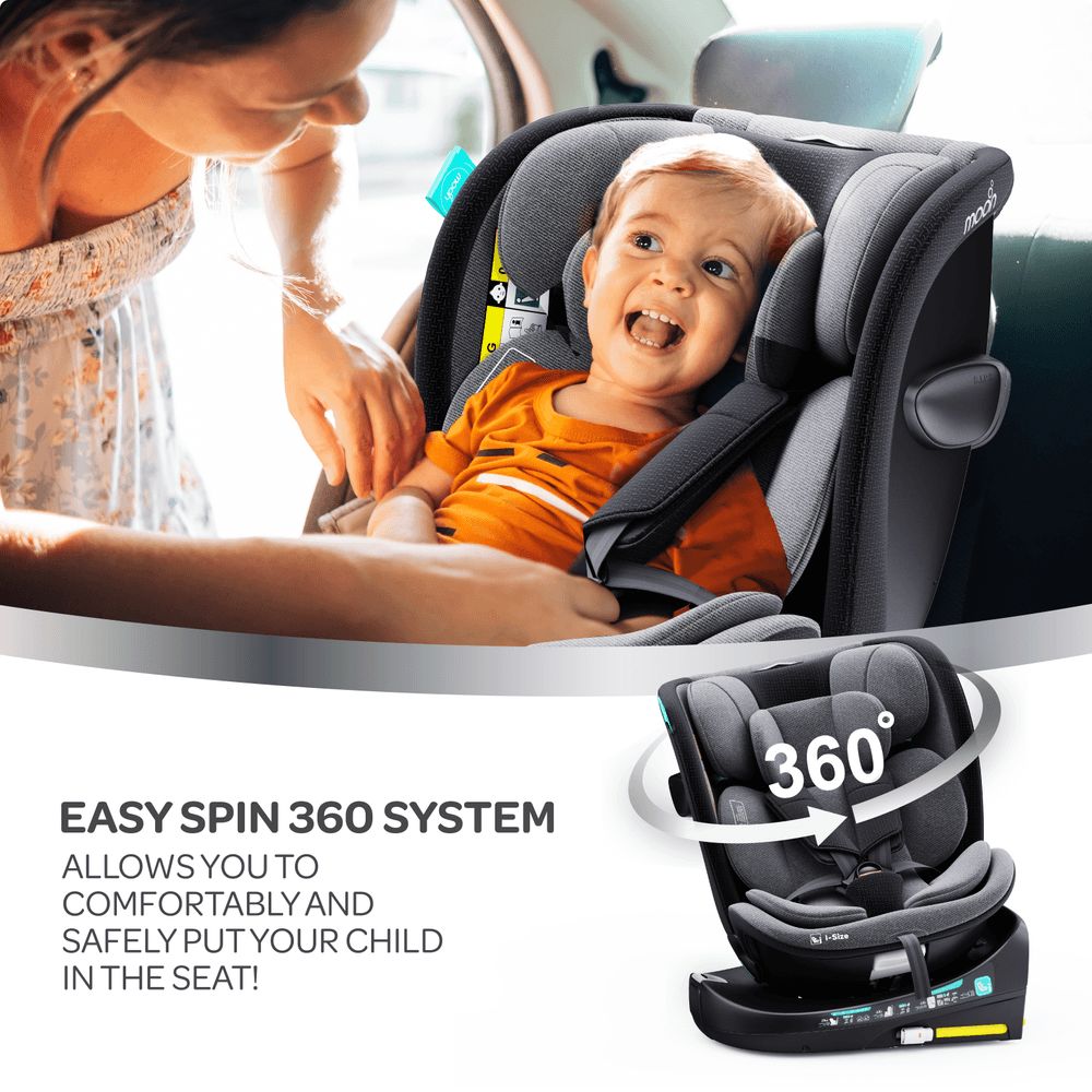 MOON Gyro Pro i-Size 360 degree Rotating Car Seat for Growing Kids. The MOON Gyro Pro Car Seat is engineered to meet the highest European safety standards, featuring the latest R129 i-Size certification. Designed to protect your child from birth to 12 years, it offers maximum safety and comfort at every stage.