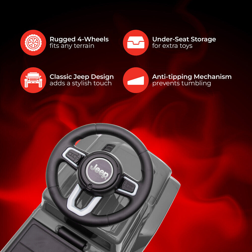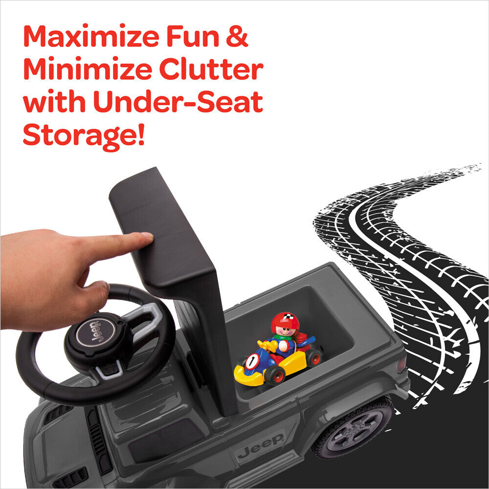 - Durable and Rugged: with four wheels and an anti-roll over stopper, this Jeep allows for safe and secure adventures. The spacious seat and rear bumper make it comfortable and perfect for playdates, while the under-seat storage provides room for toys and snacks.