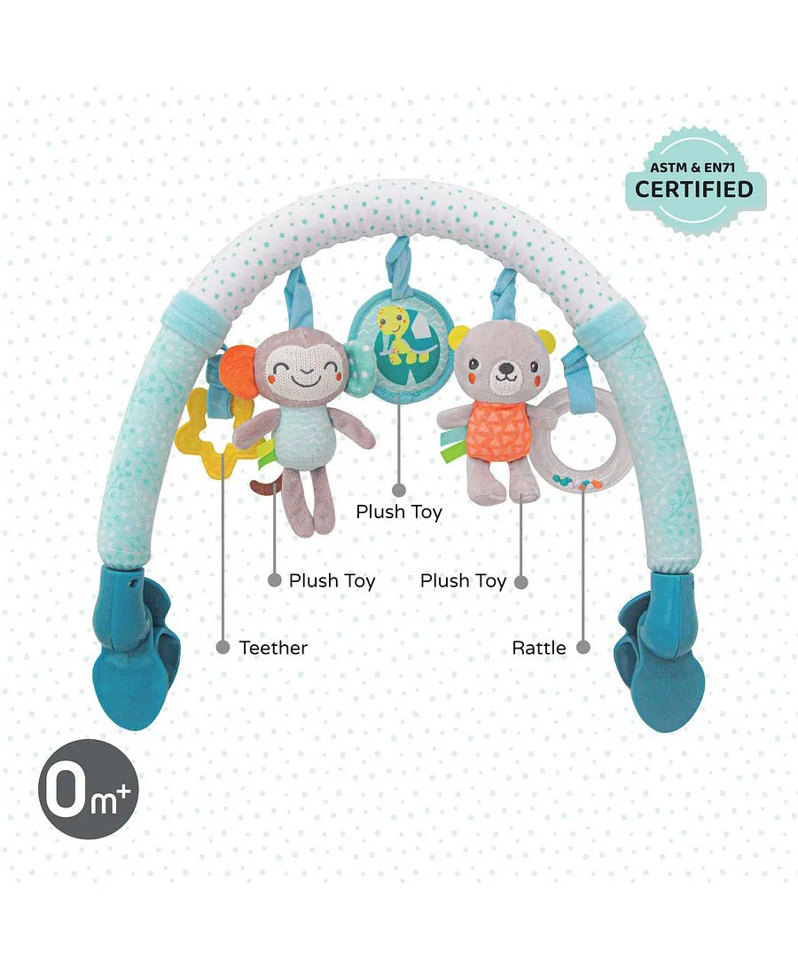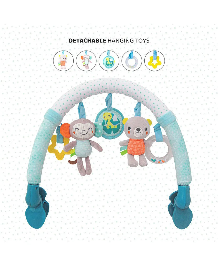 - The activity bar is made of vibrantly colores Baby will love reaching, grabbing, and observing the entertaining items on the arch while in the pram/stroller.