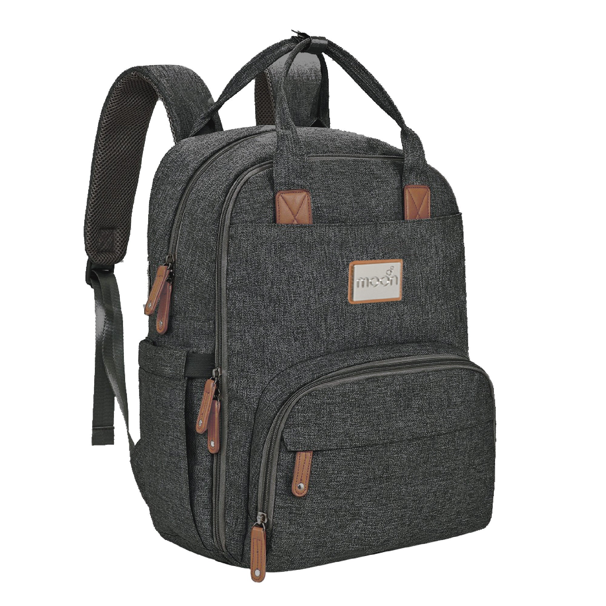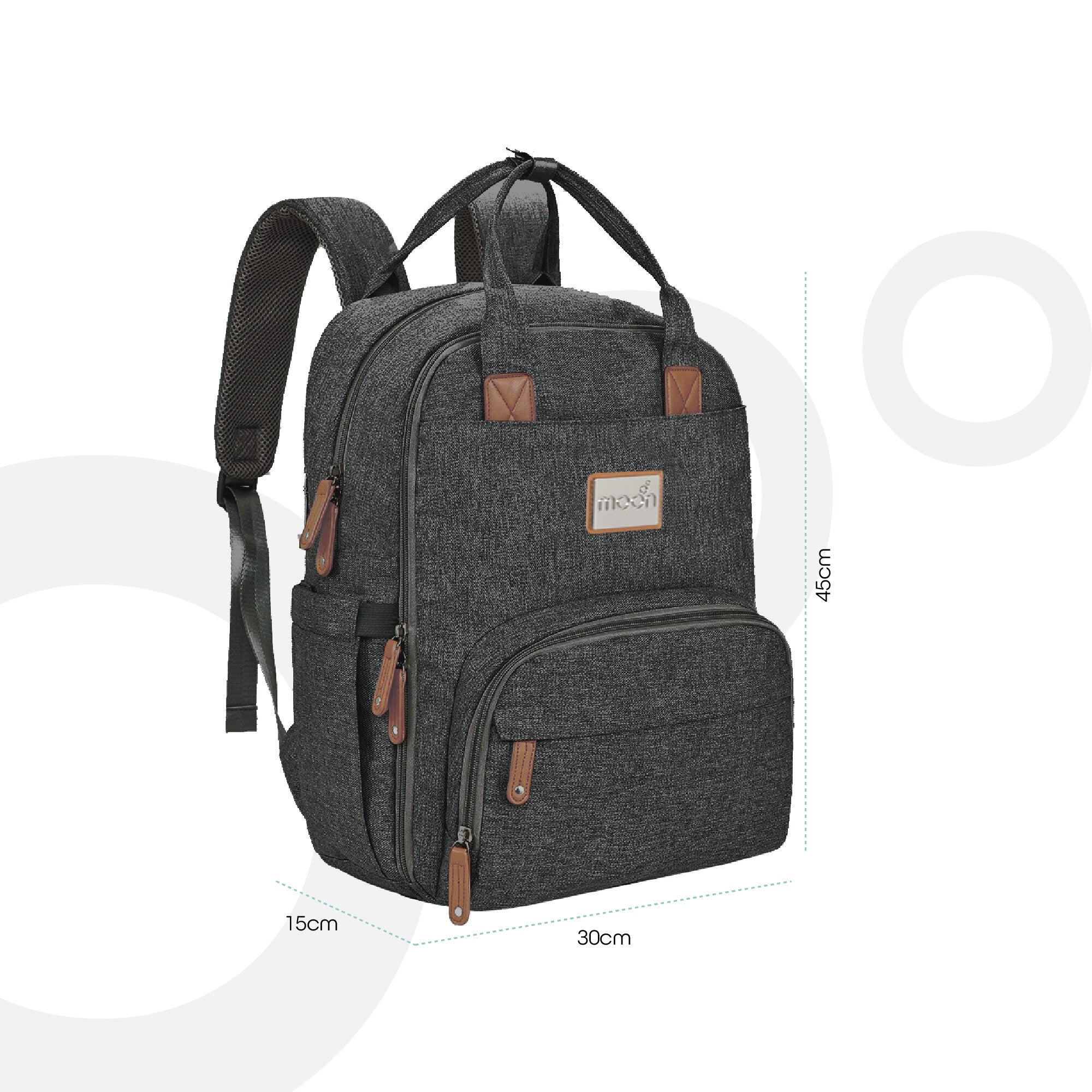 The Moon Kary Me is a spacious diaper backpack that comes with an easy wipe-clean/ foldable changing mat, stroller straps and a detachable pacifier holder. Itâs perfect for when you are on-the-go as it is not too big and not too small, just the right size. It has 2 big zipper closure compartments and 16 pockets which makes it roomy enough to hold most baby essentials, all the while looking perfectly organized and compact. It also includes insulated bottle pockets that can hold both wide neck and tall baby bottles, ranging from 5oz to 11oz. All in all, a wise choice for every mother.