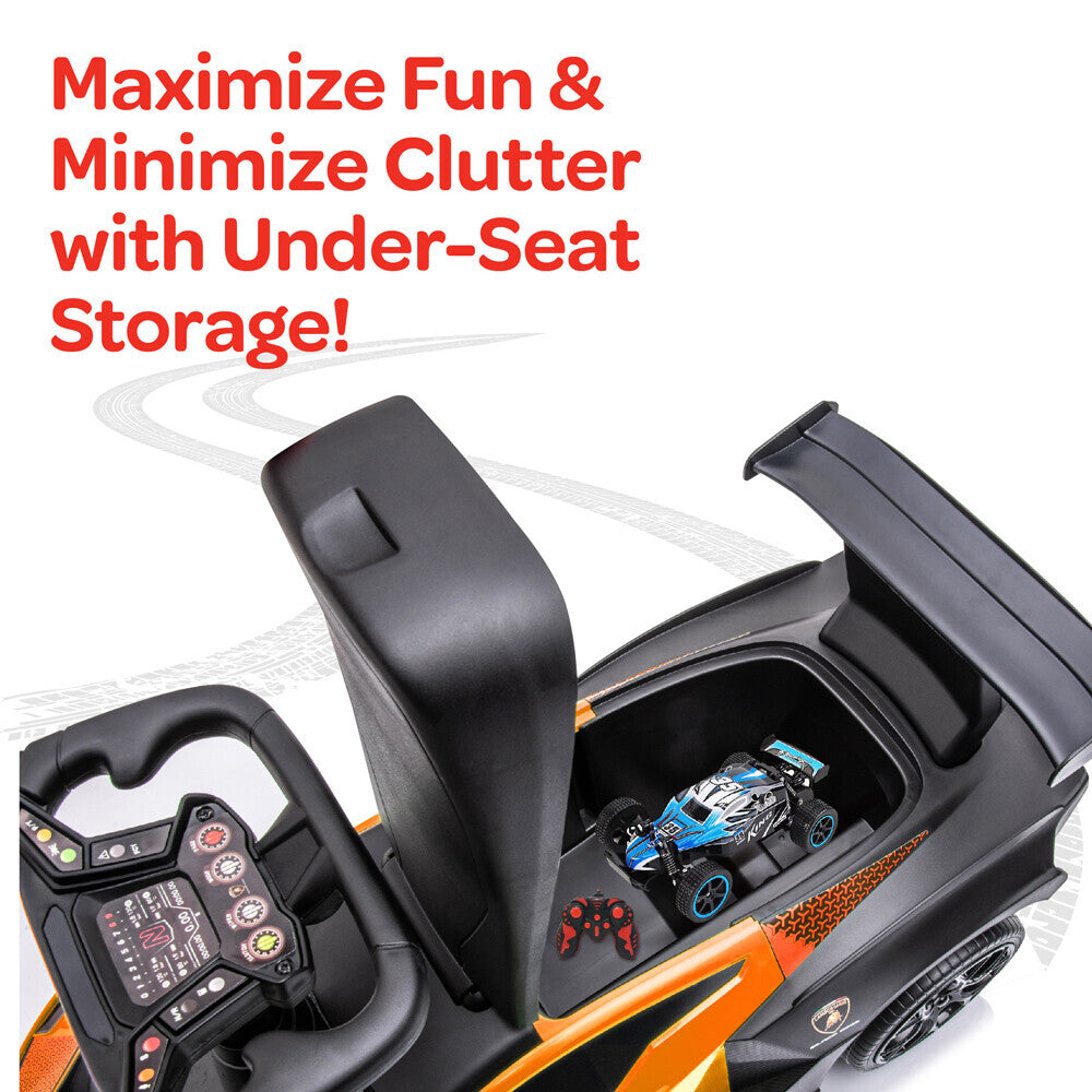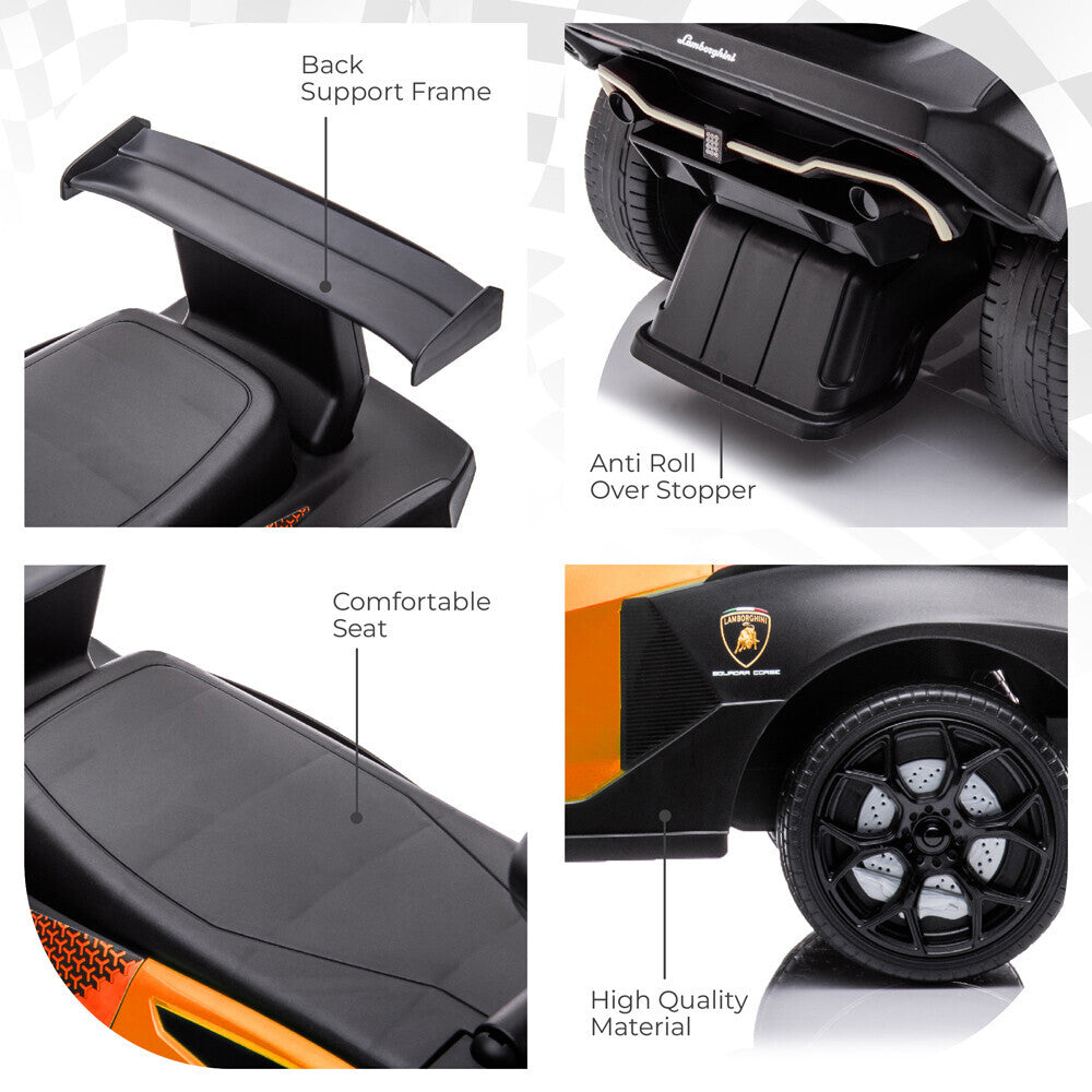 - Realistic Design, Safe and Secure: With its authentic Lamborghini design, sturdy build, and anti-roll over stopper, this ride-on car provides a safe and secure experience for your child. The spacious seat with a comfortable grip and back support frame ensures a comfortable ride every time.