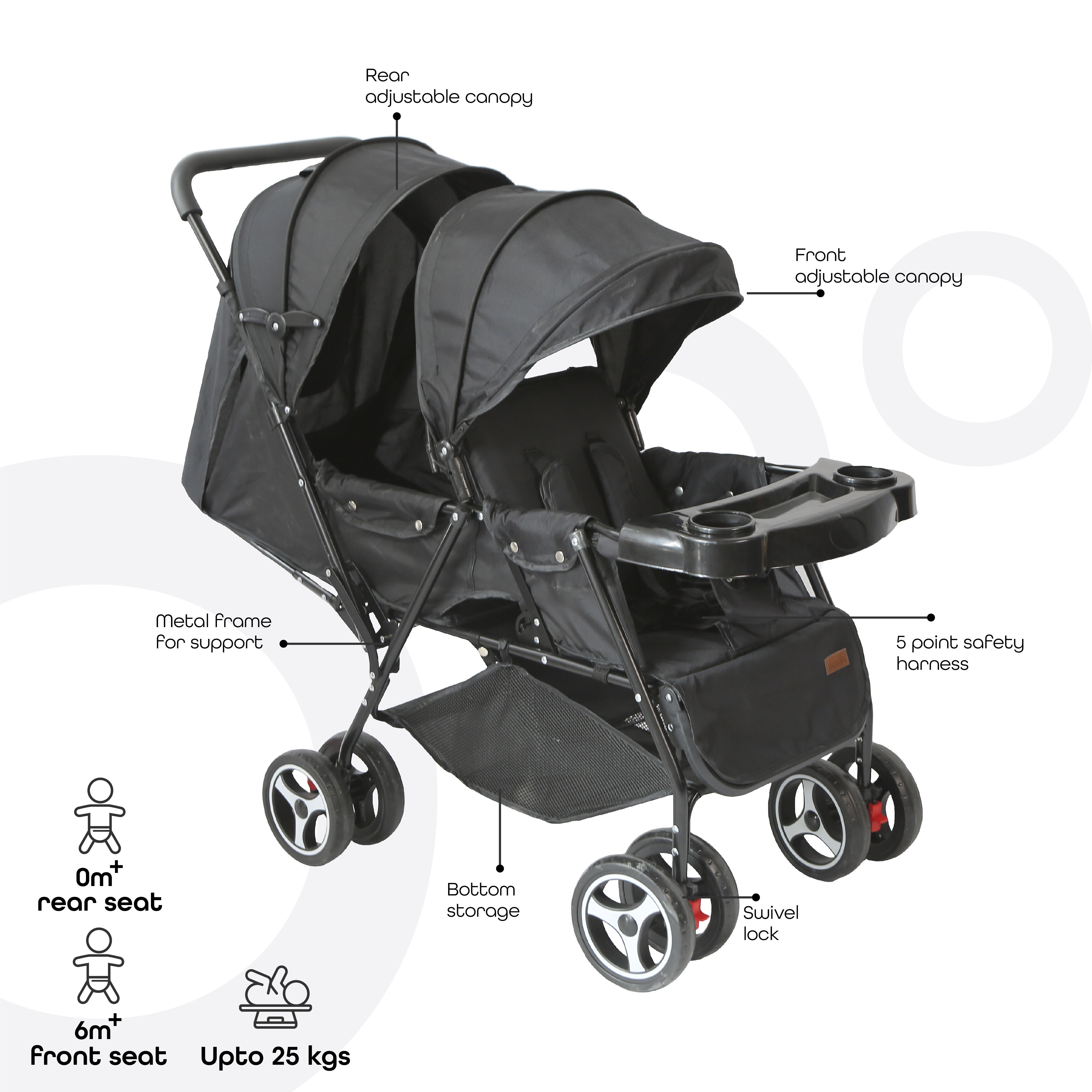 - Suitable for babies upto 15kg per seat.