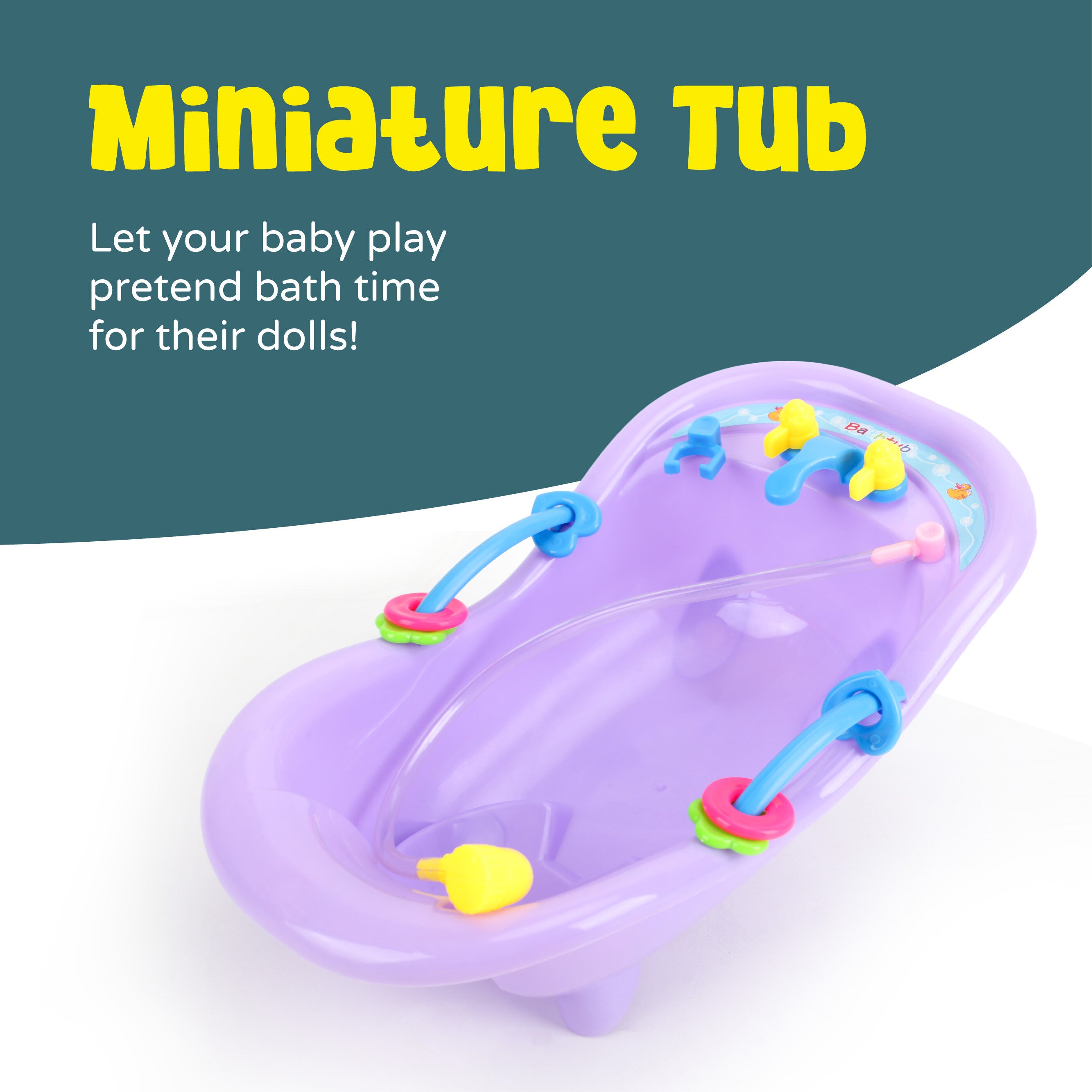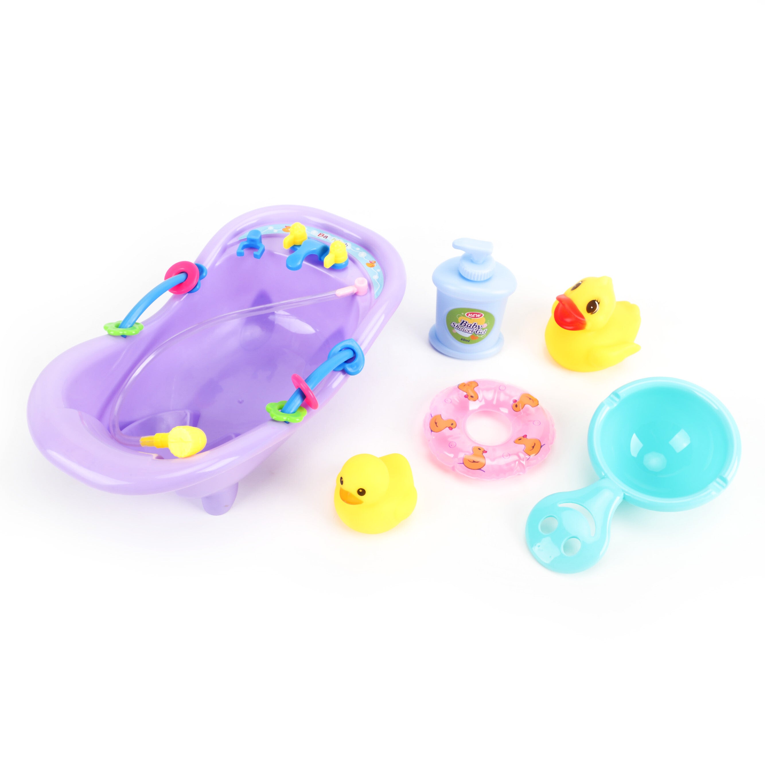 Package Includes: Duck, star fish, toy bath tub, mini soap bottle, and a scooper with smile cut-out