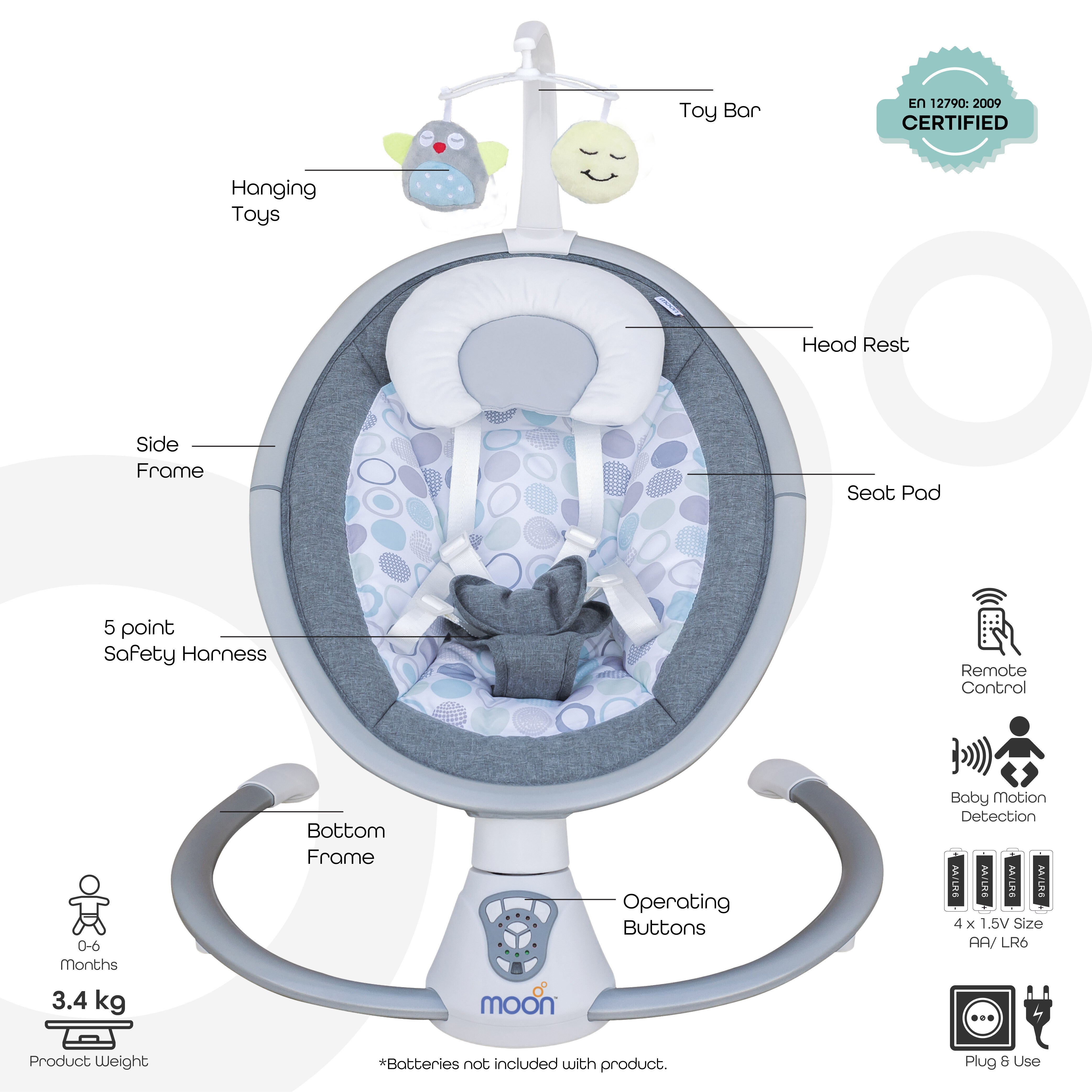- Gentle swaying motion - Babies feel most secure and sleep best in a parents arms. By mimicking a parent's gentle swaying motion, Moon Baby Swing provides your child with a safe sleeping environment