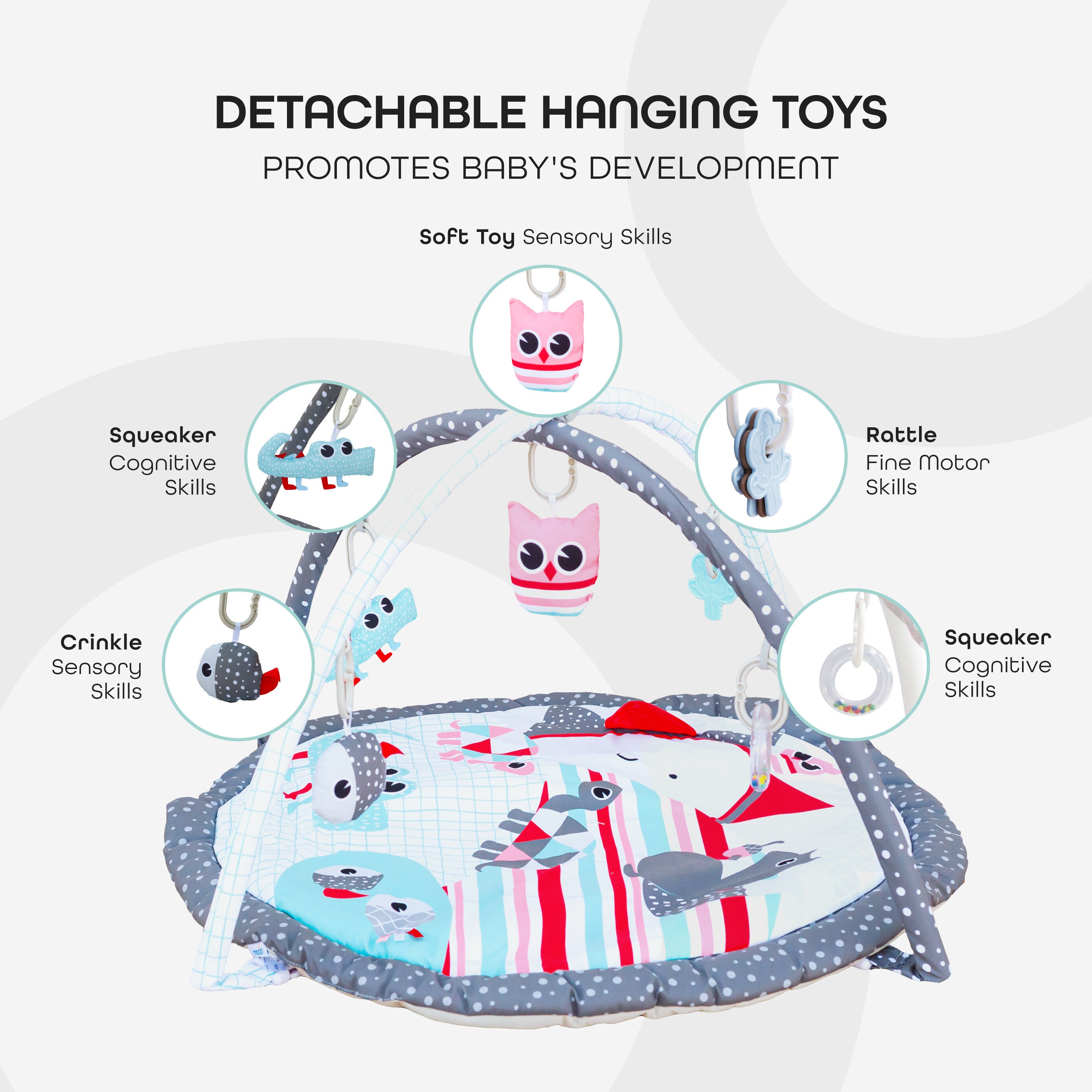 - Contents- Soft activity quilt with detachable arches and 5 detachable toys with C-rings.