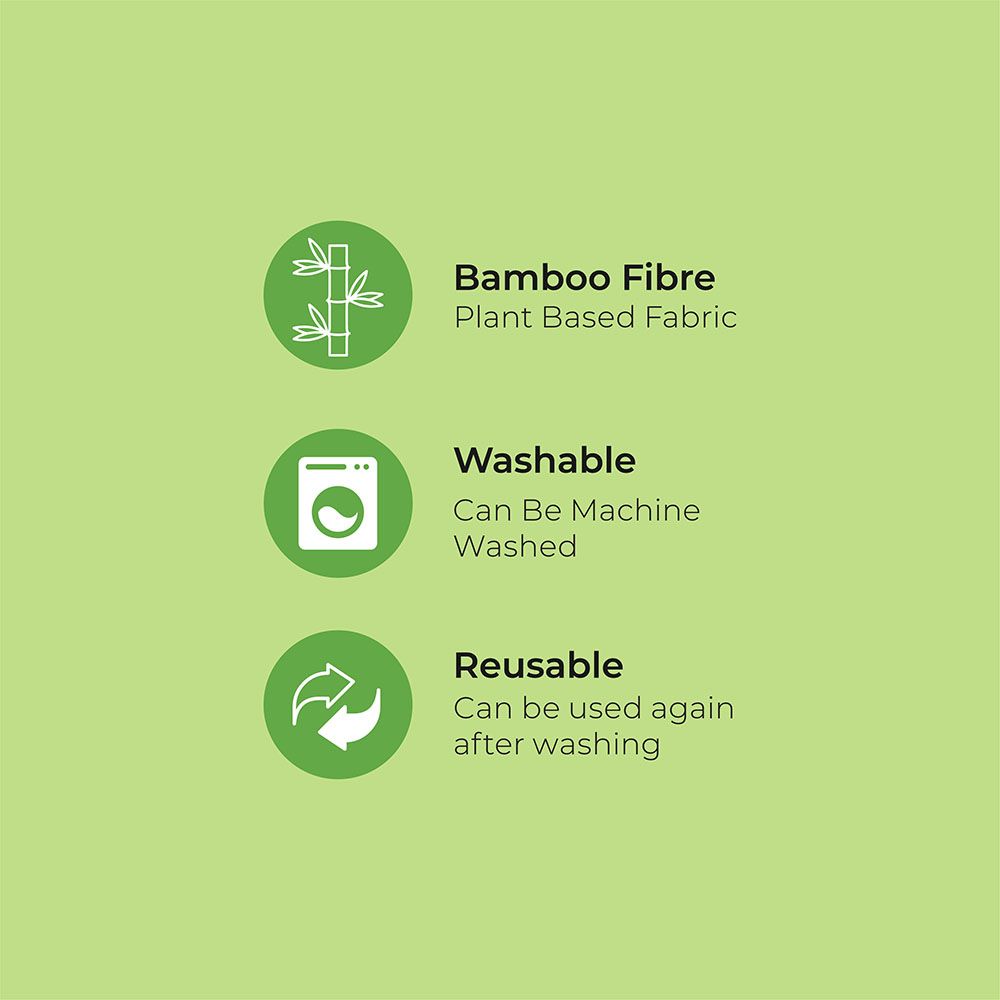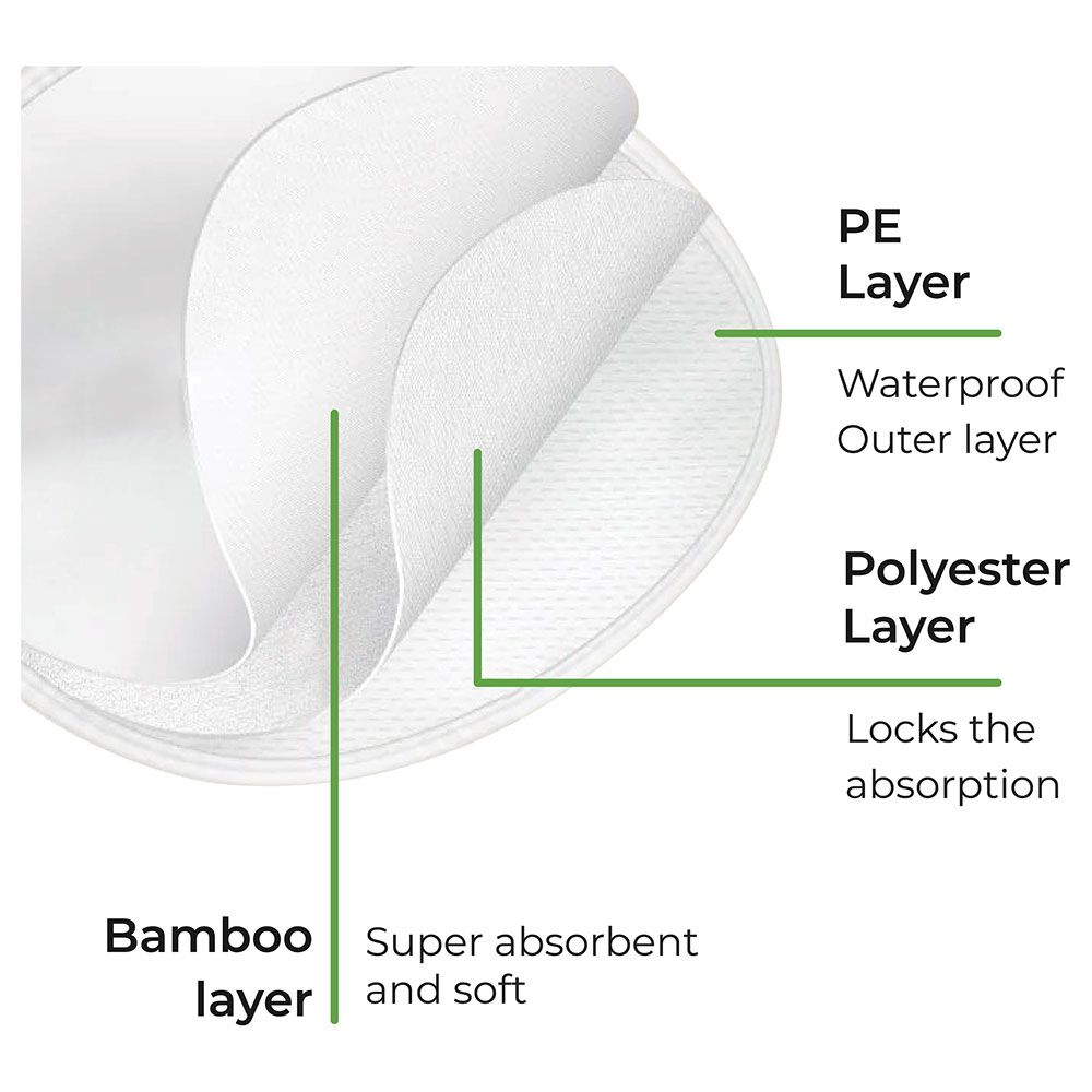 - A bamboo viscose absorbent core, and a waterproof polyester layer to prevent leaks.
