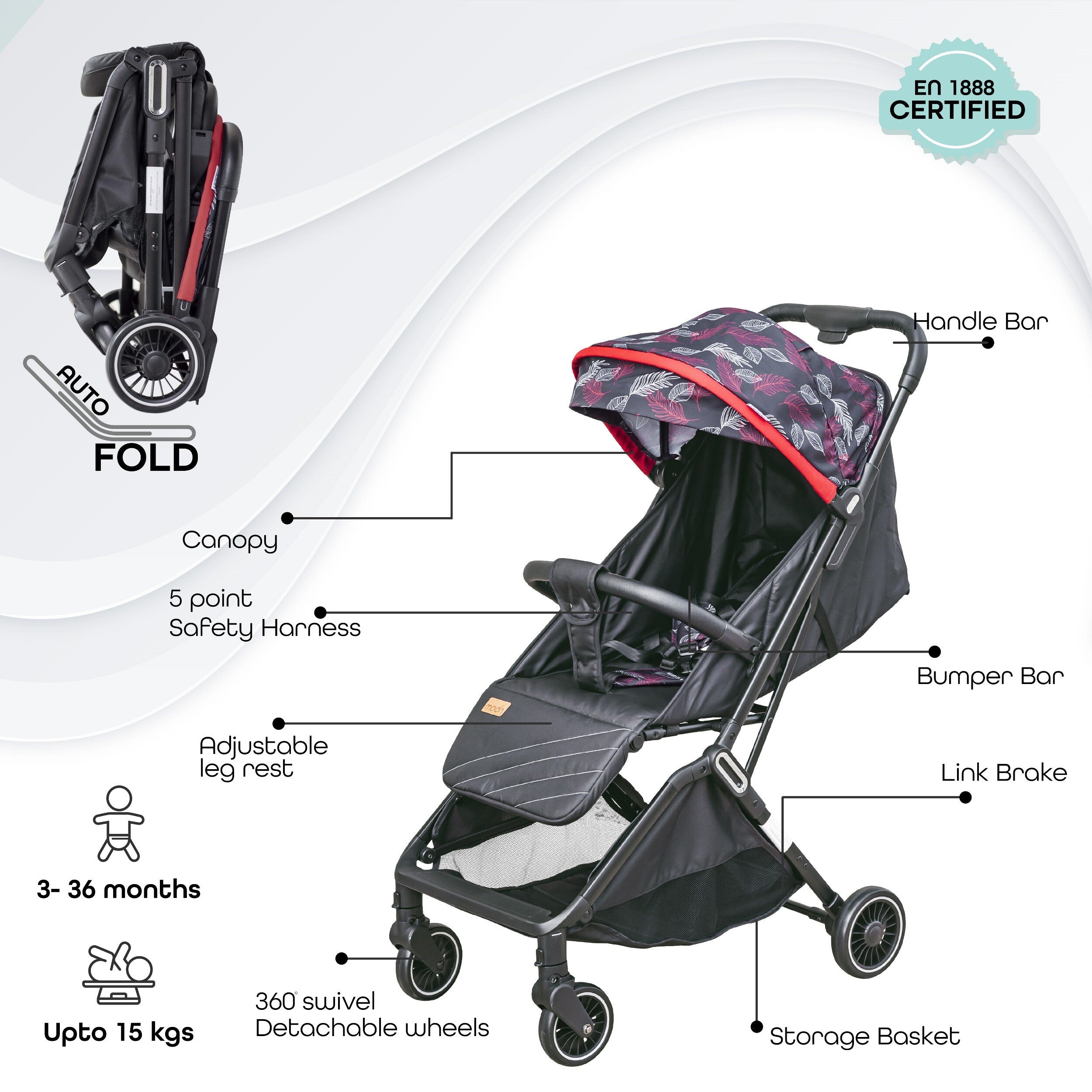 - The Cabin Stroller: Take to the skies and journey with assurance! The MOON Ritzi baby stroller features an ultra-lightweight design and a compact folding mechanism that complies with airline hand luggage requirements, allowing you to travel with the stroller without difficulty User-Friendly Build: Ritzi baby travel system is the pinnacle in walking and flying comfort, with all-terrain swiveling, lockable front wheels, one-hand maneuverability, an adjustable, multi-angle reclining seat, and a 5-point harness system with optimal fit for all sizes Ultimate Convenience: The airport will be a breeze with this baby travel gear for airplane. Ritzi push chair will guarantee that you never lose your stroller and is perfect if you have a young child who has to remain in their stroller throughout the airport Smart Baby Trolley: Featuring single piece eco-leather grip, five-point seatbelts with cushioned shoulder straps, foldable and collapsible shopping basket with easy access from all sides, and an additional storage space in the shopping cart Unparalleled Quality: Made to strict EN 1888 guidelines, this stroller & pram can hold a child from birth to 3 years up to 15 kg. The durable fabric used to make the seat will last for years to come. Black, Black-Red, Grey, Black-Grey Dots, and Black-Blue Dots are the color options
