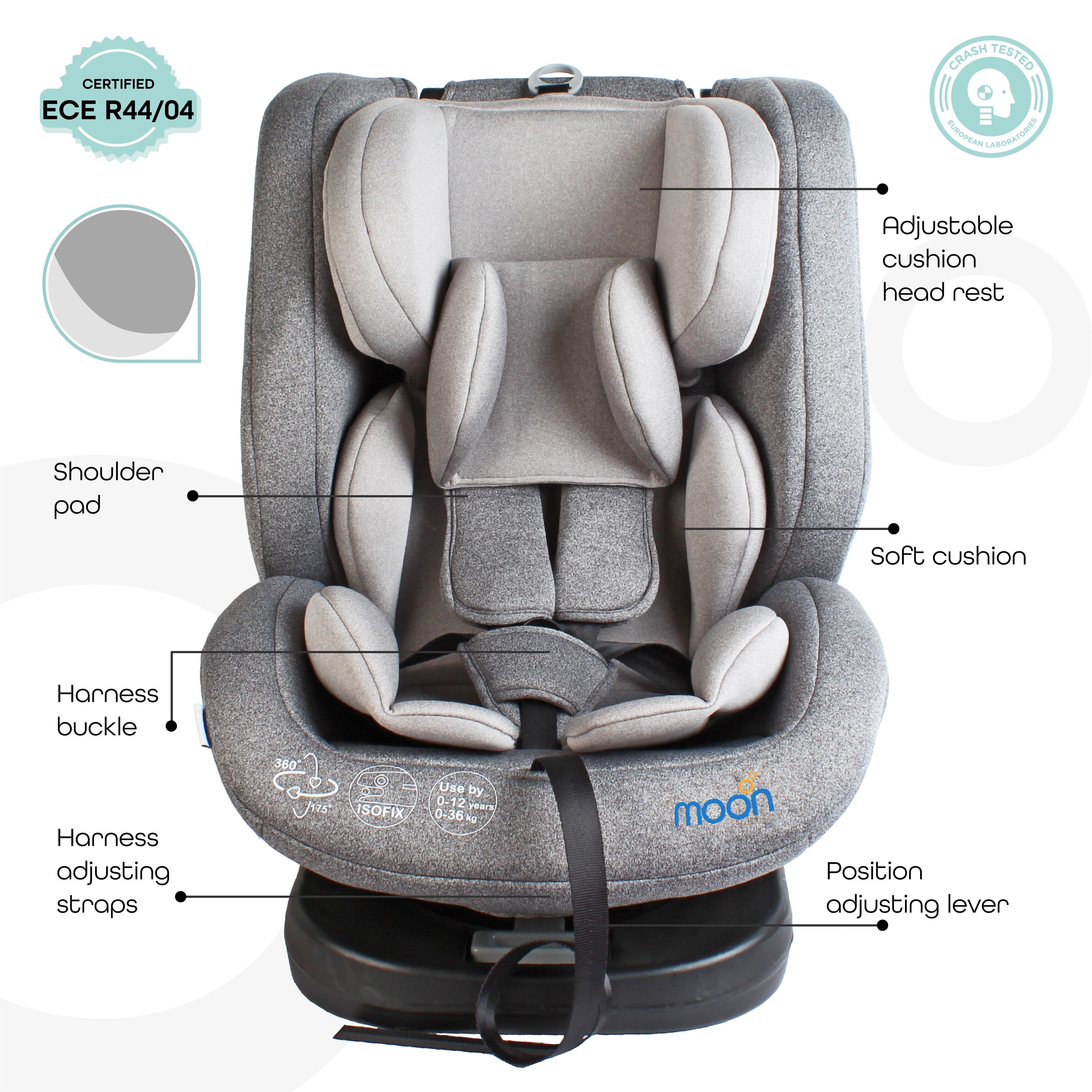 - All-Inclusive Car Seat: Never sacrifice child safety! You can always rest easy knowing that your child is safe in the MOON Rover. This car seat for kids booster can be rotated a full 360 degrees, is convertible, reclining, and weight and age-appropriate up to 12 years old and 36 kg