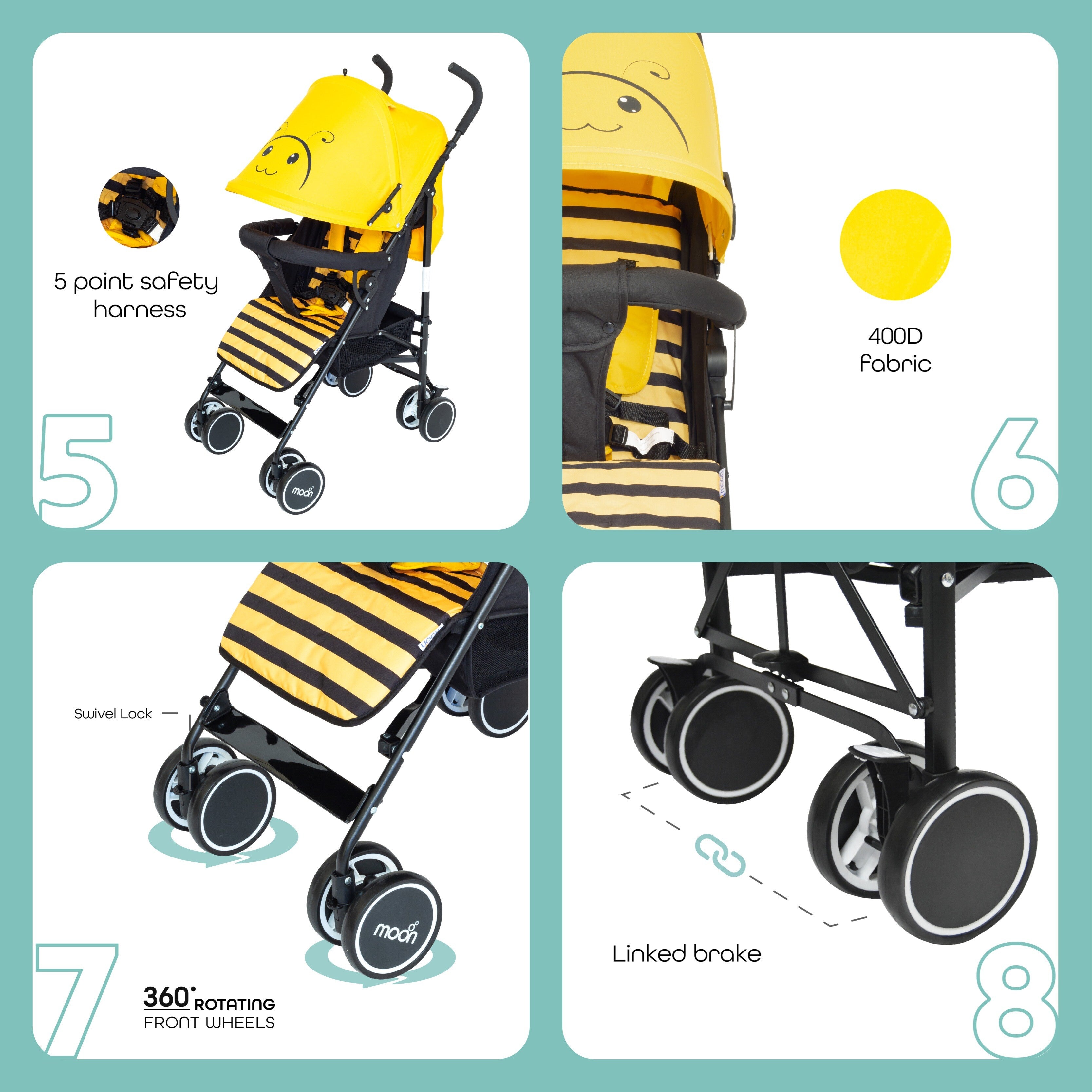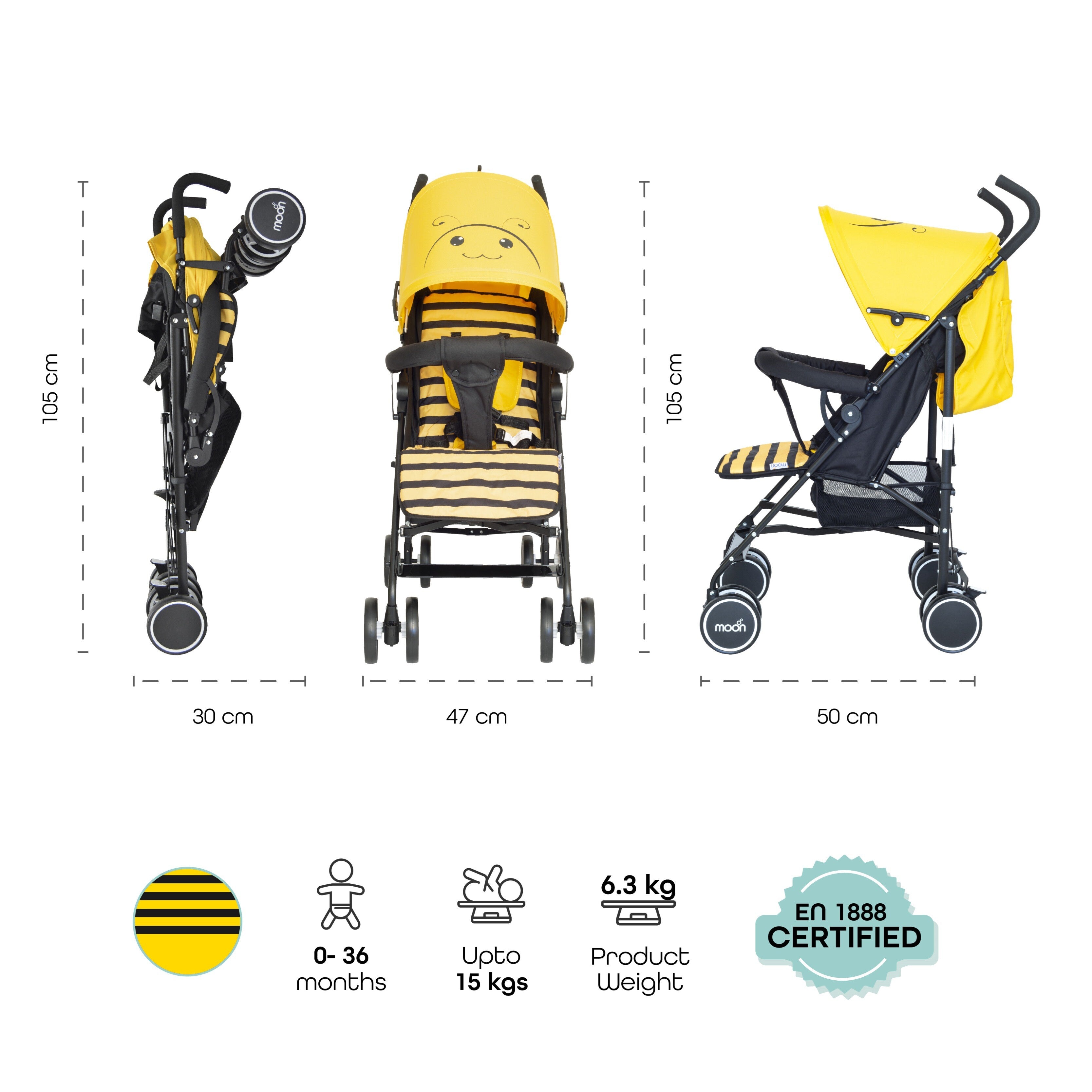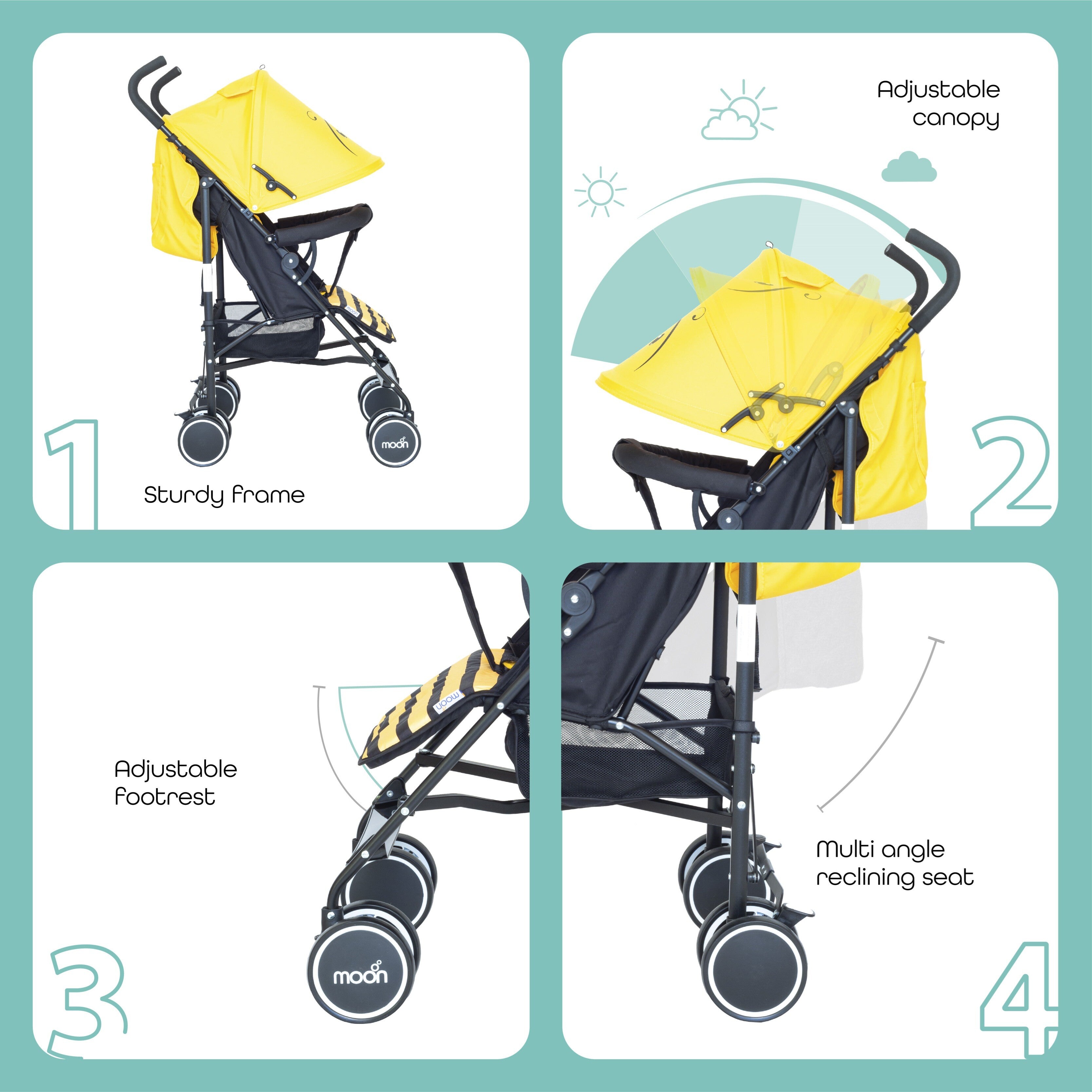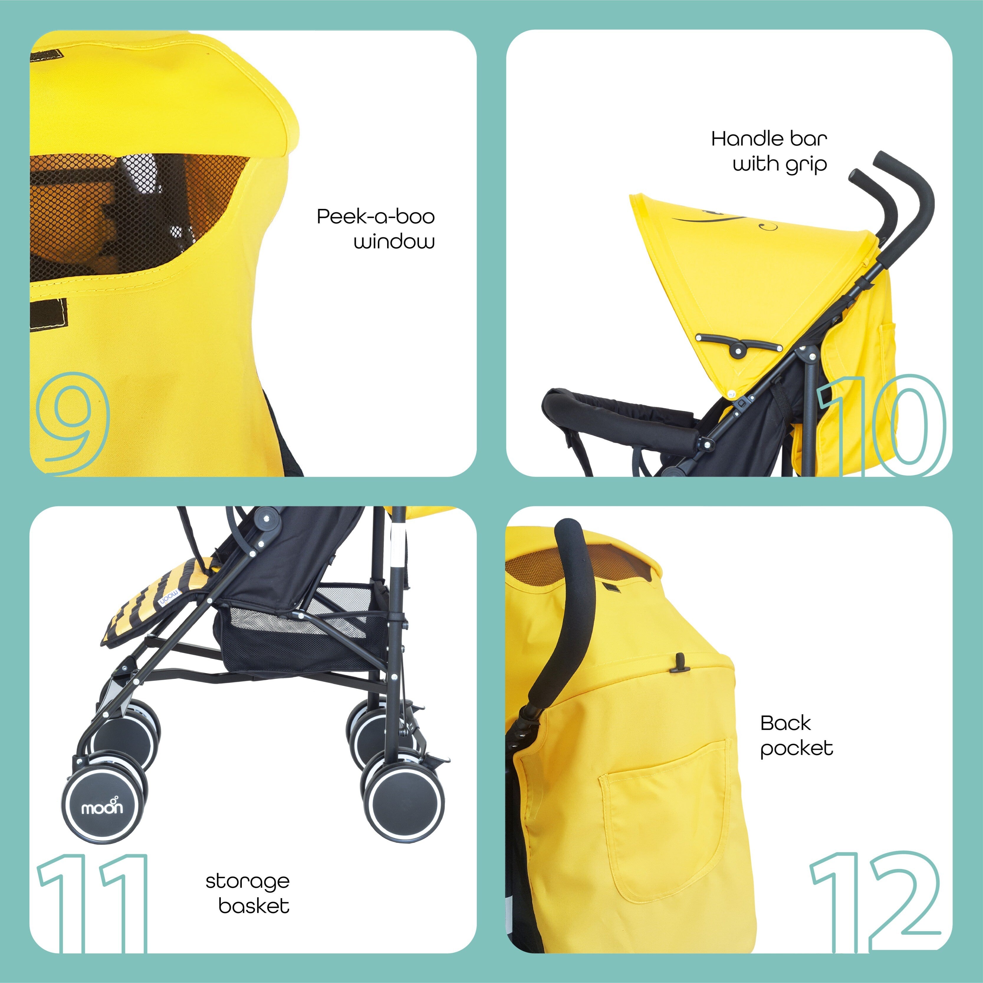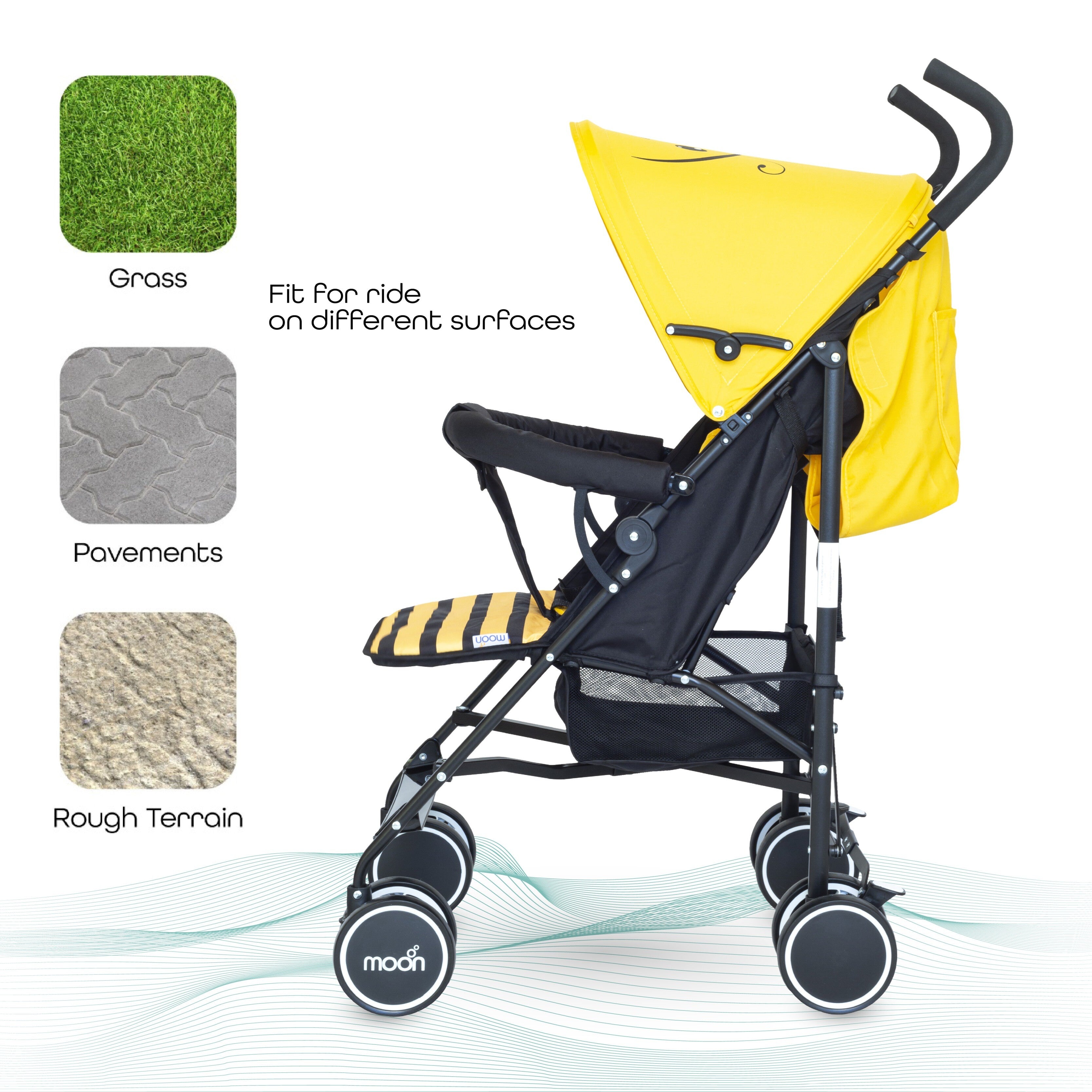 Your children will be simply enamored! Moon Safari stroller & pram comes donning animal characters, including an amazingly endearing bee, shark, dinosaur, cat, lion or a panda -themed decorated in eye-catching hues and richly decorated patterns. So be prepared to field brand-new demands for adventures in this character compact fold stroller every day!