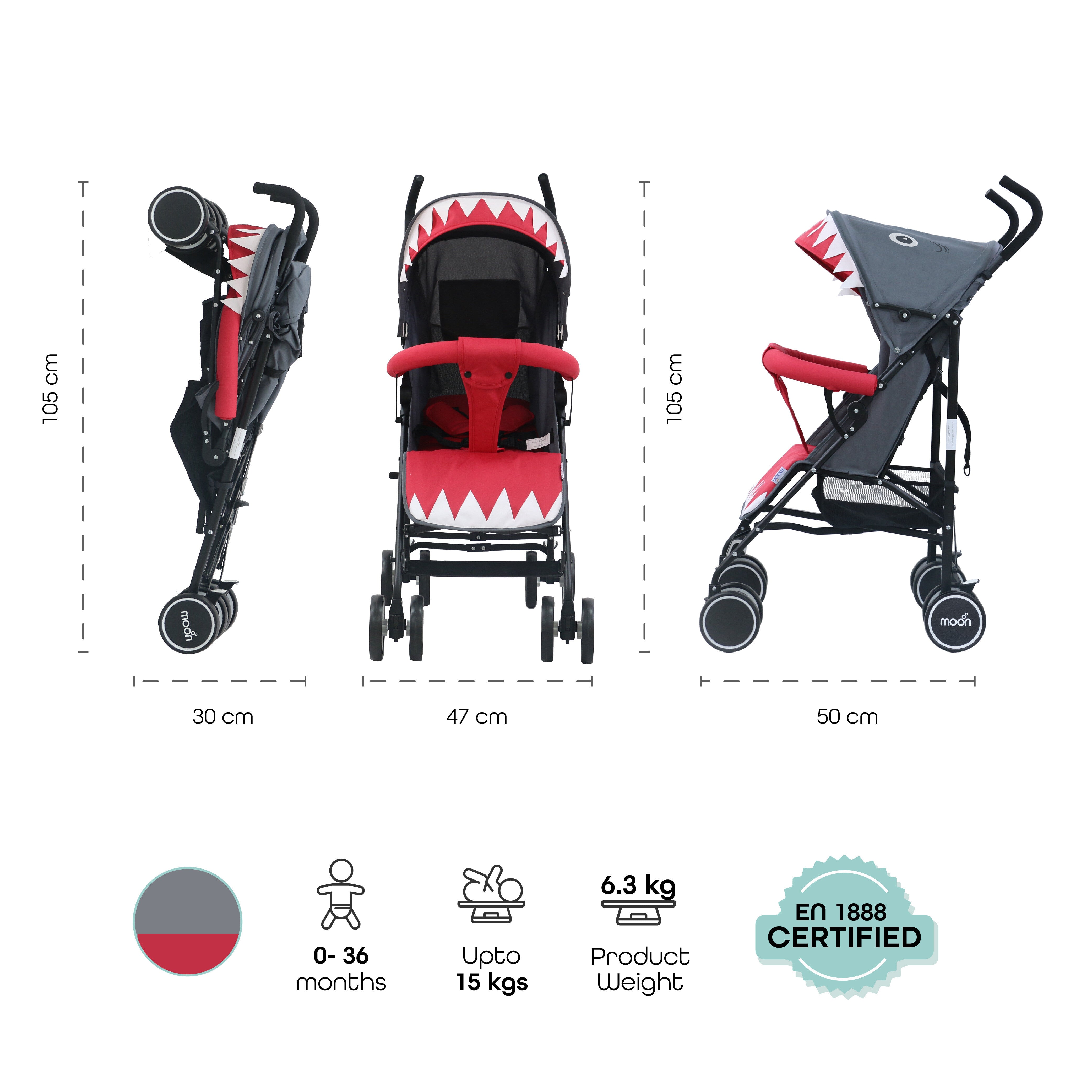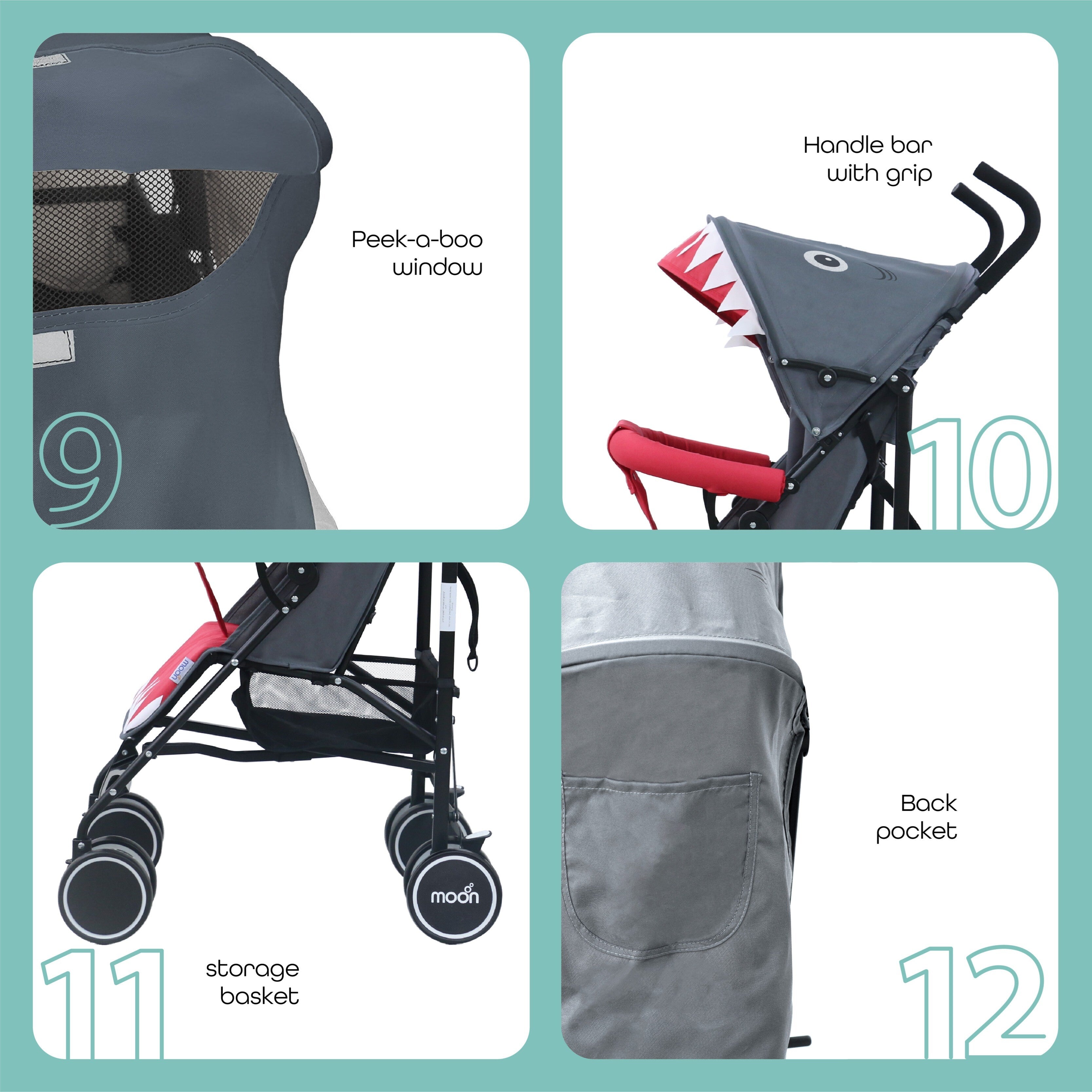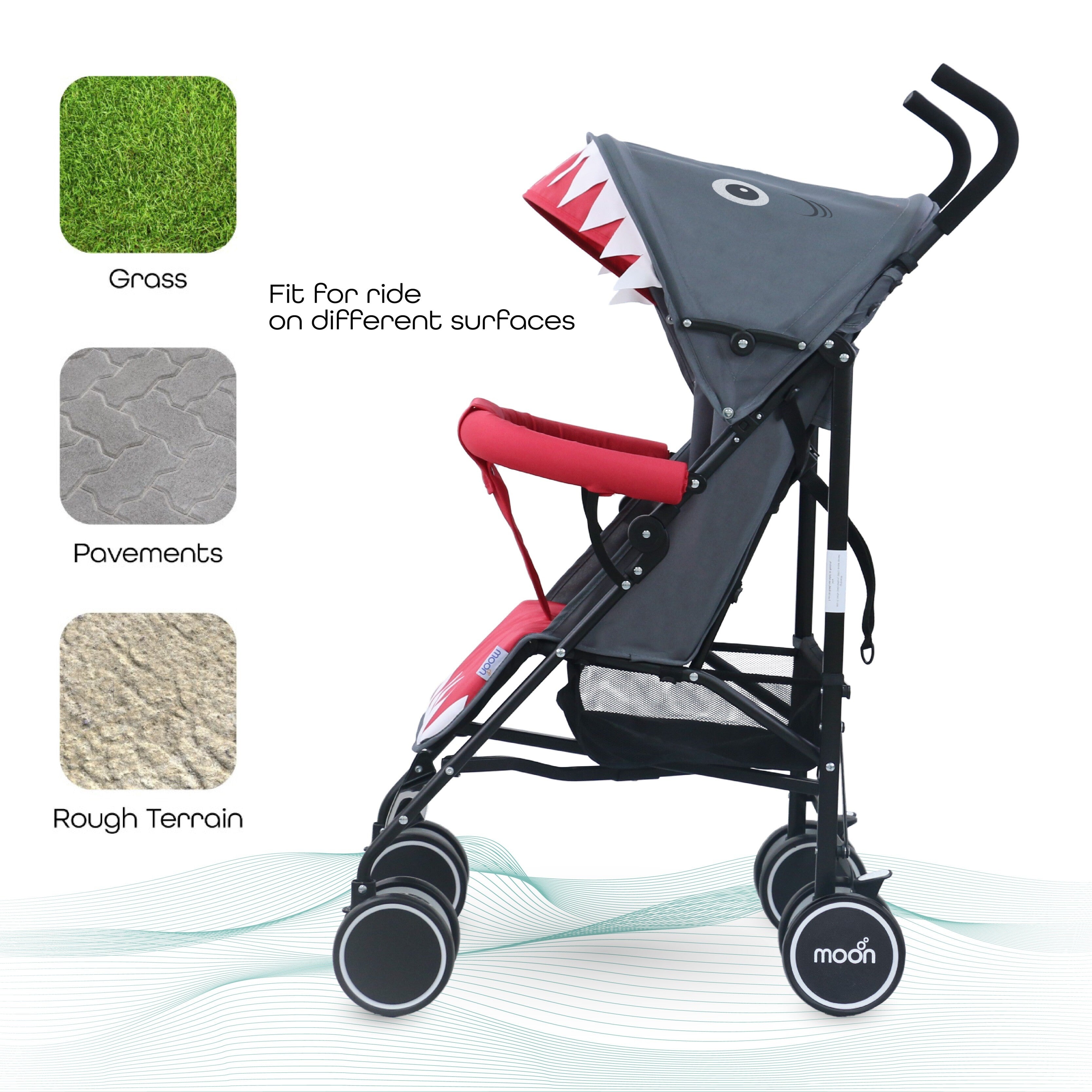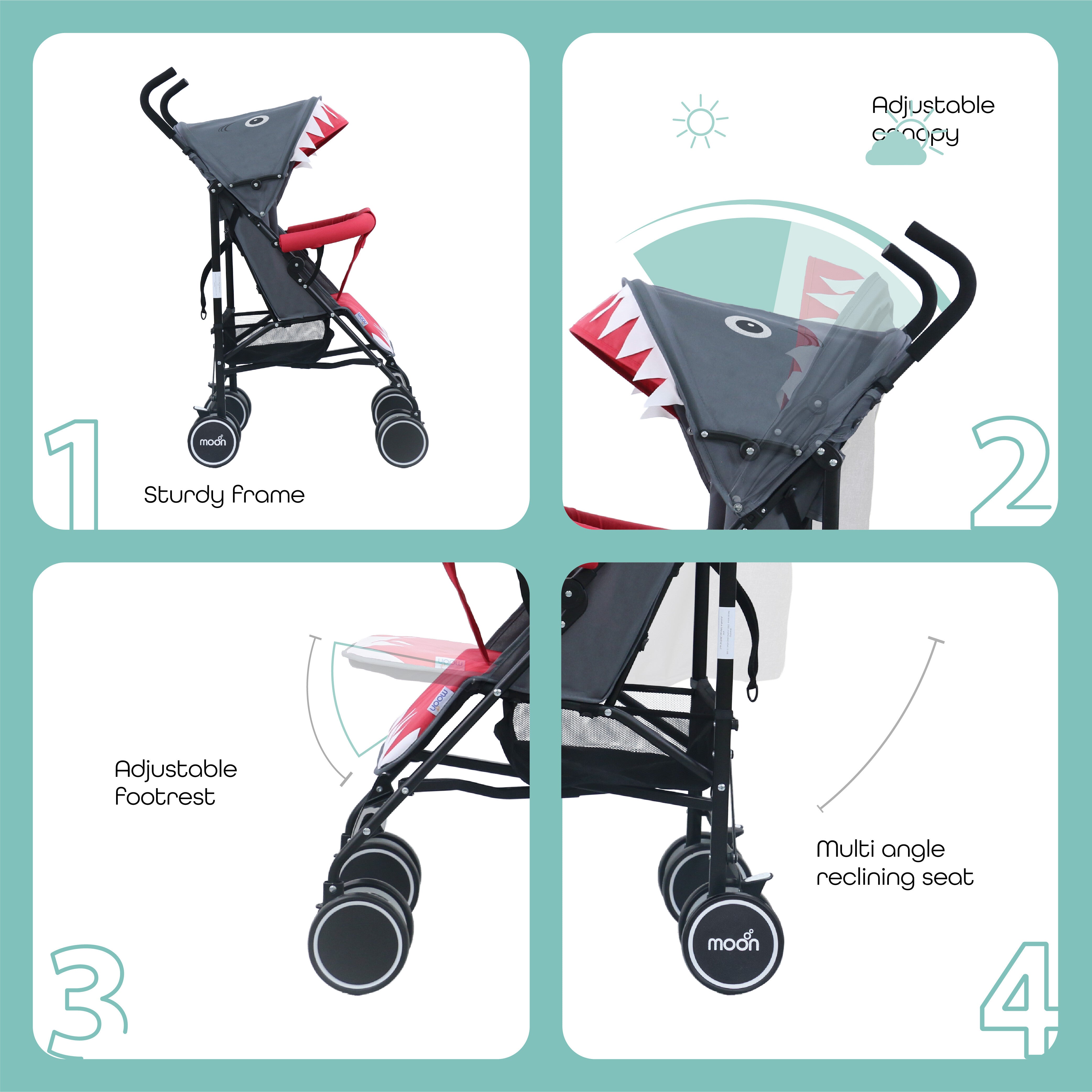 Your children will be simply enamored! Moon Safari stroller & pram comes donning animal characters, including an amazingly endearing bee, shark, dinosaur, cat, lion or a panda -themed decorated in eye-catching hues and richly decorated patterns. So be prepared to field brand-new demands for adventures in this character compact fold stroller every day!