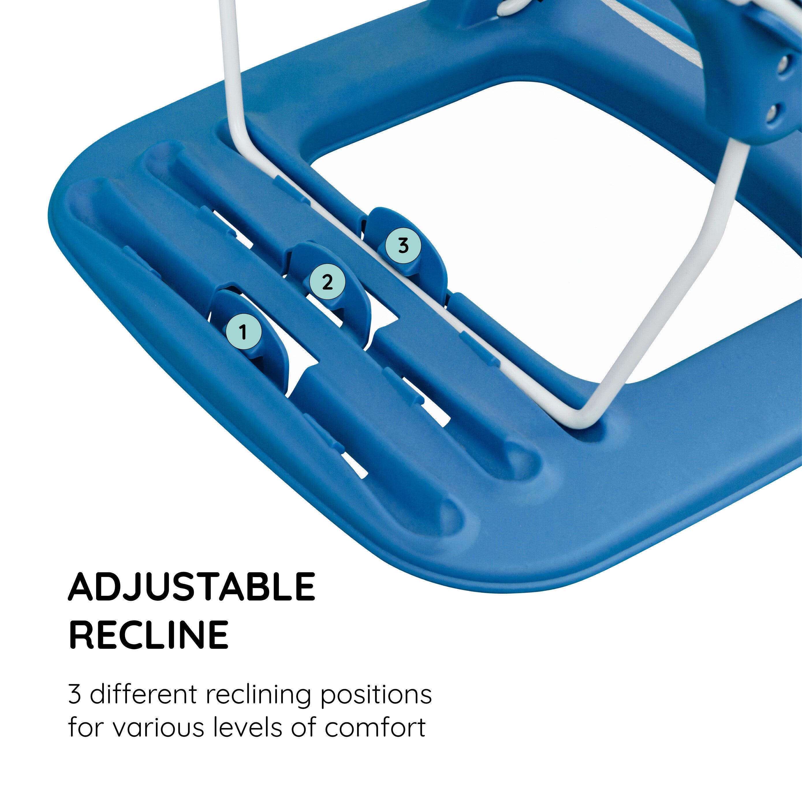 - You can adjust the baby seat's reclining backrest to one of three positions to keep your baby secure and contained with head support during bath time.